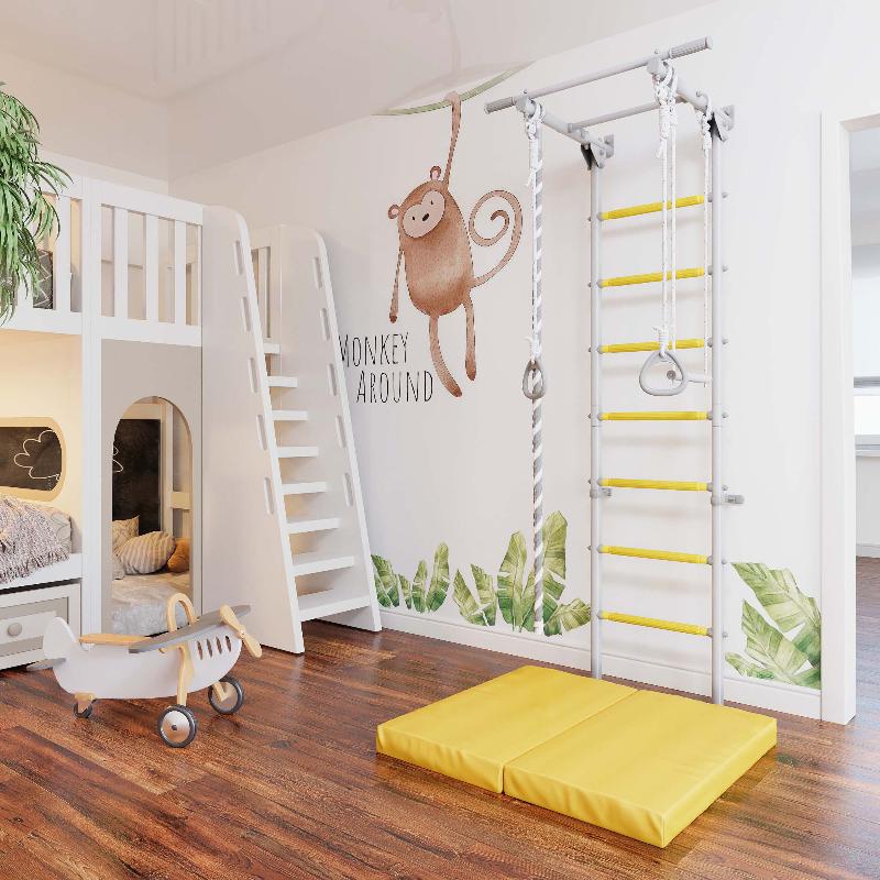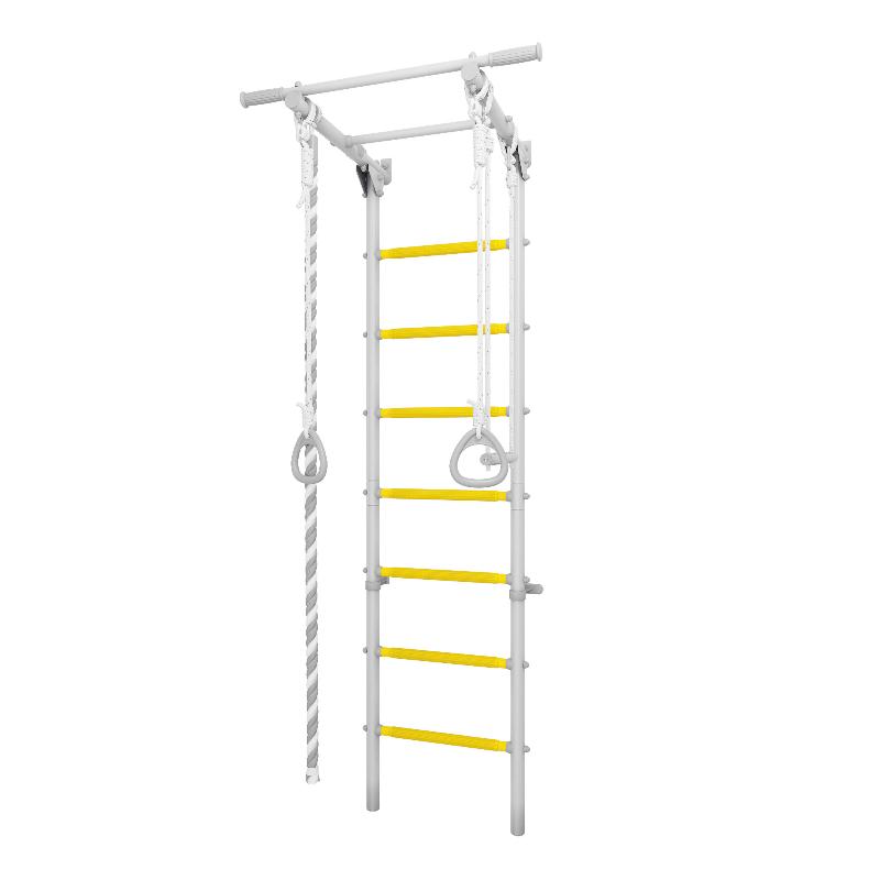Пастельные оттенки ступеней идеально сочетаются с серым корпусом, благодаря чему спортивный уголок гармонично вписывается в любой интерьер.