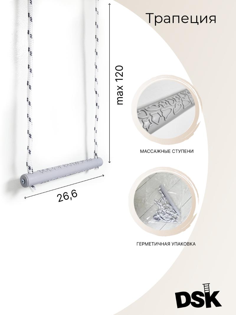 В комплект детского спортивного комплекса входит навесное оборудование: трапеция, канат и гимнастические кольца треугольной формы, которые обеспечивают комфорт и безопасность, так как не проворачиваются во время занятий.