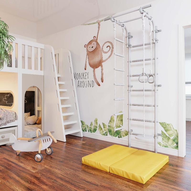 Комплекс оснащен навесным оборудованием: гимнастическими кольцами треугольной формы, которые не проворачиваются, веревочной лестницей с массажными ступенями и подвесом. Это делает занятия не только эффективными, но и безопасными. Массажные ступени из мягкого пластика предотвращают скольжение, способствуют профилактике плоскостопия у детей и всегда остаются комфортными на ощупь. Серый дизайн стенки гармонично впишется в любой интерьер, подчеркивая стиль вашего дома.