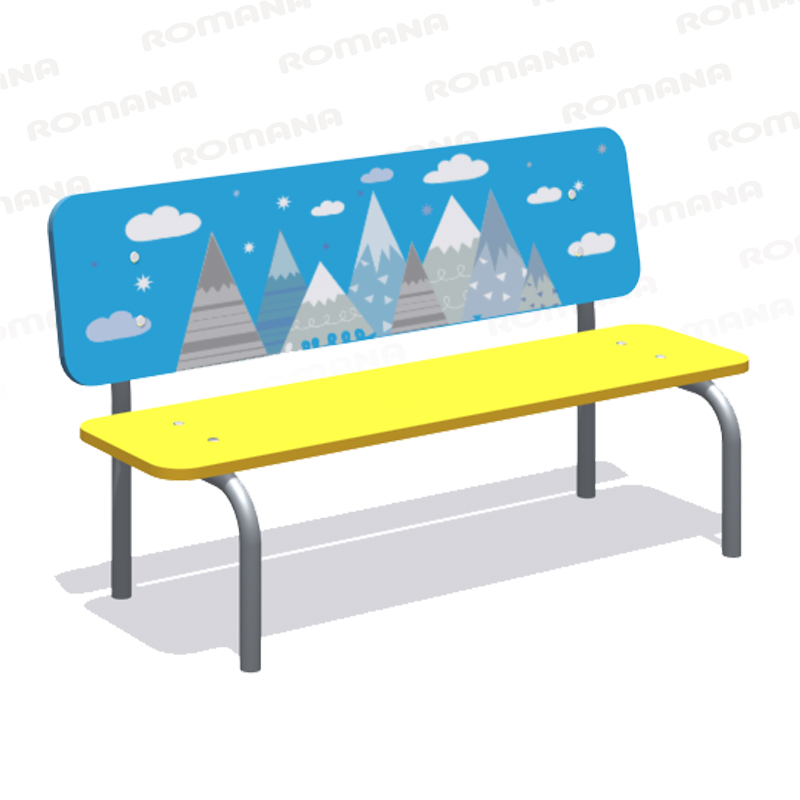 Скамья детская «Romana 302.09.00» двухцветная детская скамейка со спинкой для детских площадок, спортивных городков, детских садов. Спинка изделия декорирована рисунком «Горы», выполненным «УФ»-печатью.