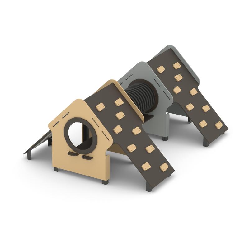 Игровой модуль для тематических игр и физического развития предназначен для детей в возрасте от 4 до 8 лет. Изделие должно представлять собой устойчивую конструкцию, обеспечивающую безопасные условия для занятий на открытом воздухе. Конструкция должна обладать высокой ударопрочностью и виброустойчивостью.В сборе представляет собой конструкцию в виде двух домиков соединенных гофрированной трубой, с отверстиями лазами и надстроенными над ними лазами наклонными.Изделие устанавливается на открытых уличных участках, находящихся под контролем ответственного лица – эксплуатанта. Установка Изделия должна проводится на ровной площадке, свободной от насаждений. В зоне приземления должно быть ударопоглощающее покрытие (песок, древесные опилки) минимальной толщиной 300 мм.
