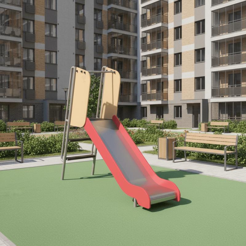 Горка предназначена для размещения на территориях детских дошкольных учреждений, парков, в дворах и местах общественного отдыха с целью организации досуга и гармоничного развития детей в возрасте от 4 до 12 лет. Может эксплуатироваться круглогодично во всех климатических зонах.Горка представляет собой металлическую лестницу c фанерными ступенями, площадку, ограждения площадки и скат. Горка имеет стартовую площадку, полосу скольжения и полосу торможения. В целях безопасности на стартовом участке горки предусмотрены защитные боковые экраны. Высота горки составляет 950 мм.