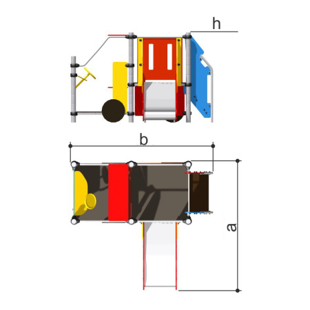 Игровой комплекс состоит из двух площадок. Первая площадка выполнена в виде кабины, имеет сиденье и руль. Вторая площадка выполнена в виде кузова и располагается на высоте 650 мм. от уровня поверхности площадки. К ней присоединяются лестница и горка.