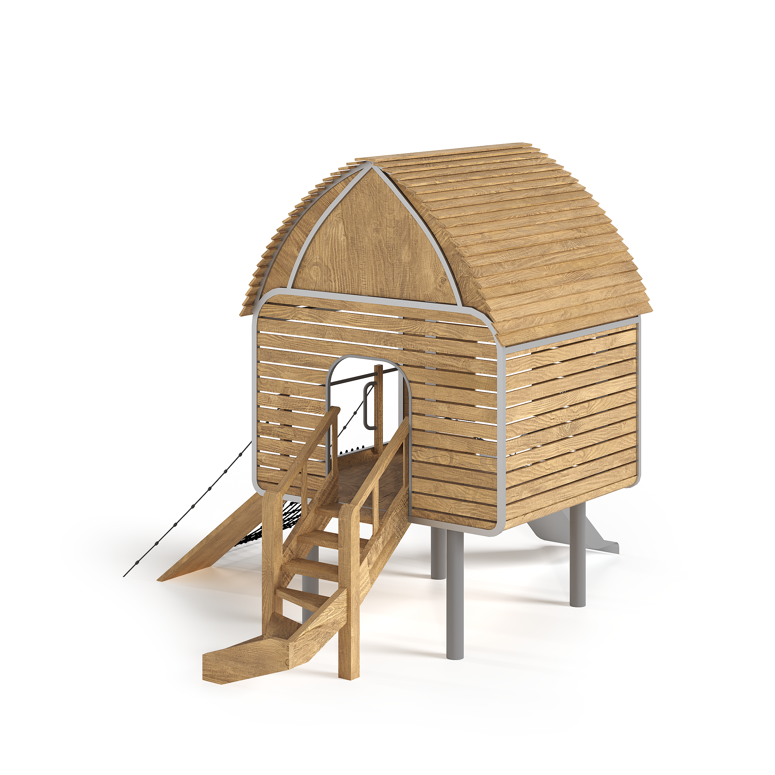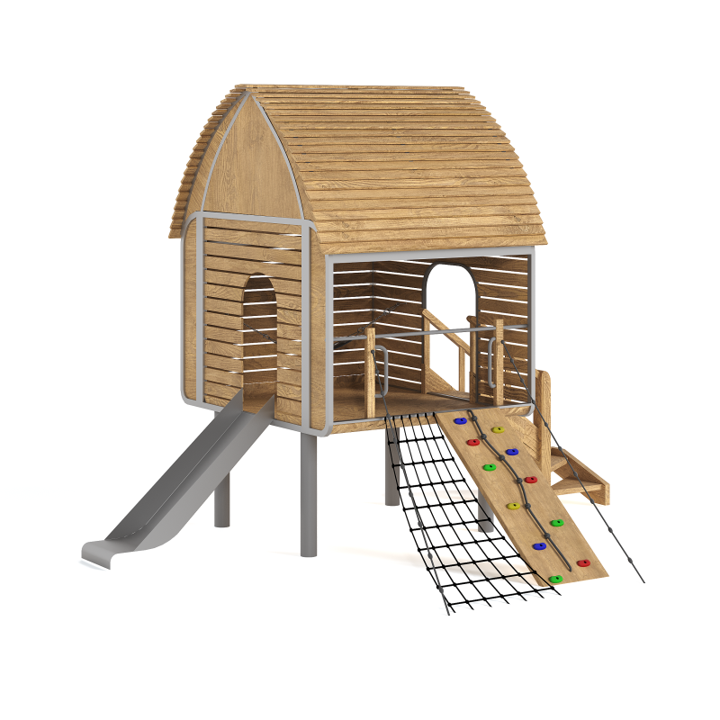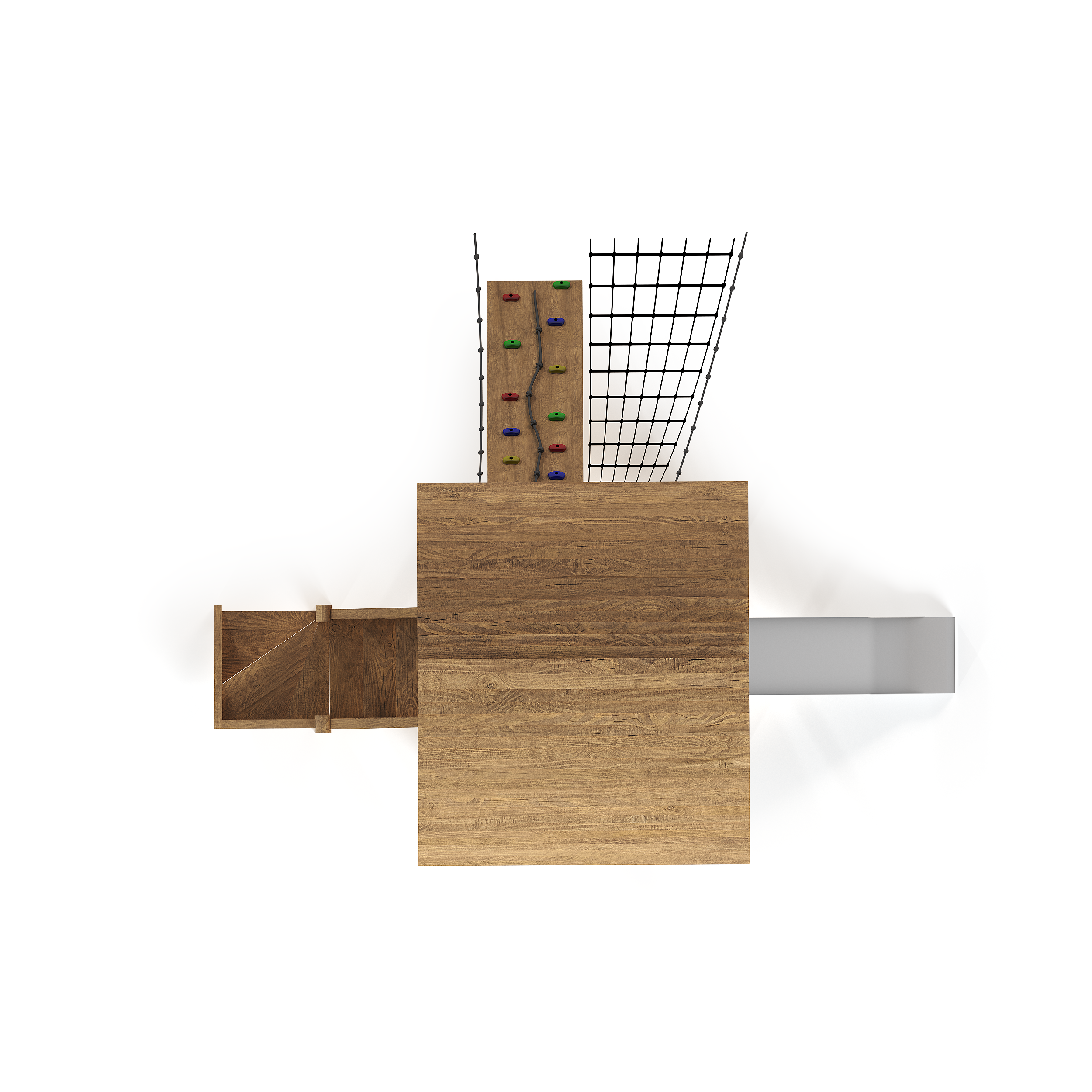 Каркас - сталь конструкционная, покрытие - цинкосодержащий грунт, окраска полимерным порошком или двухкомпонентной полиуретан-акриловой эмалью (RAL по согласованию). Обшивка - дерево, покрытие - антисептик, масло террасное атмосферостойкое или акриловая эмаль атмосферостойкая для древесины. Канатные сети, лазы - канат армированный 16 мм. Горка - сталь нержавеющая толщиной не менее 2 мм, электрохимическая пассивация сварных швов. Зацепы для скалолазания - пескобетонный композит.