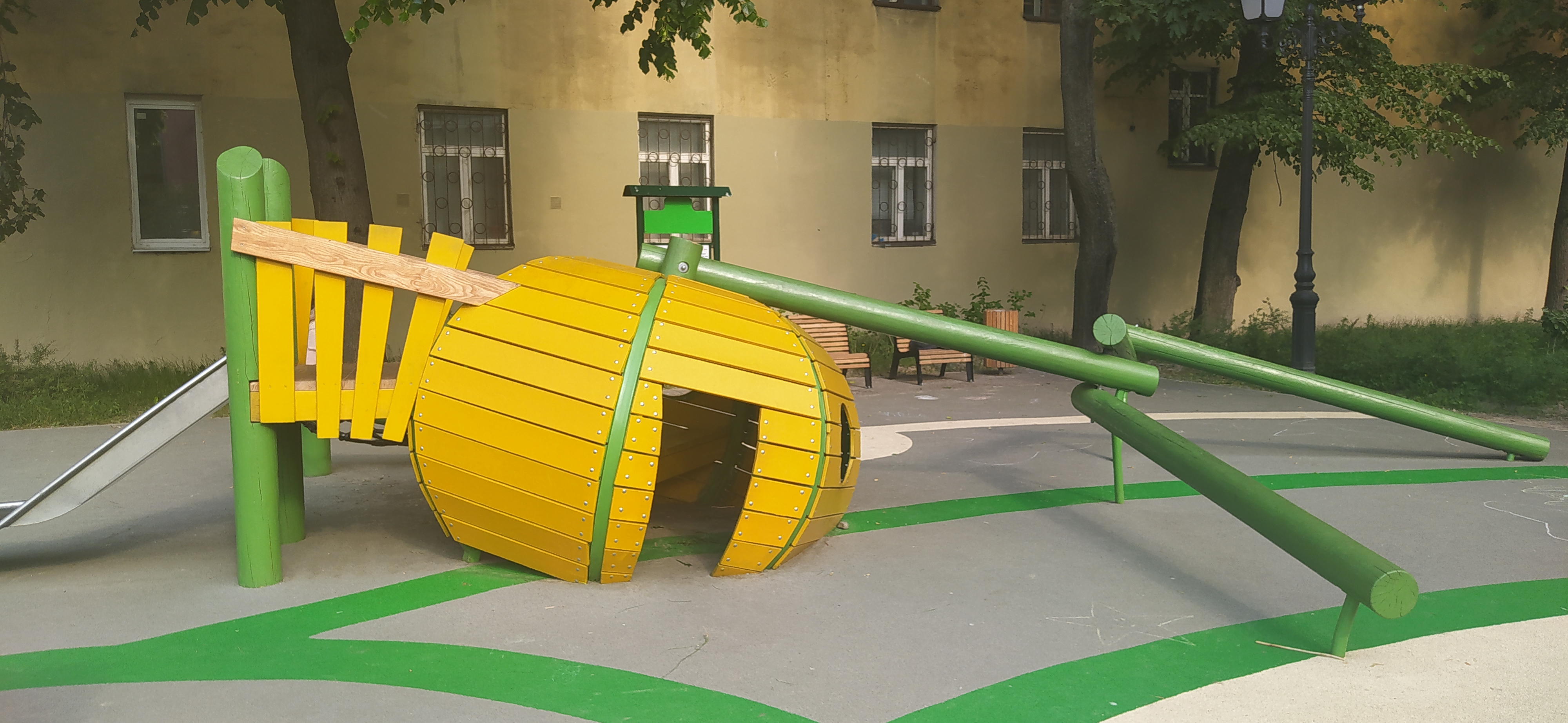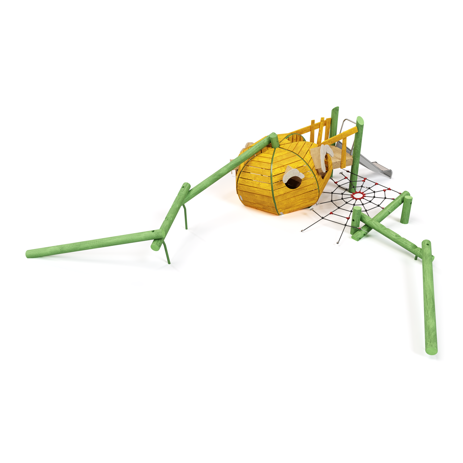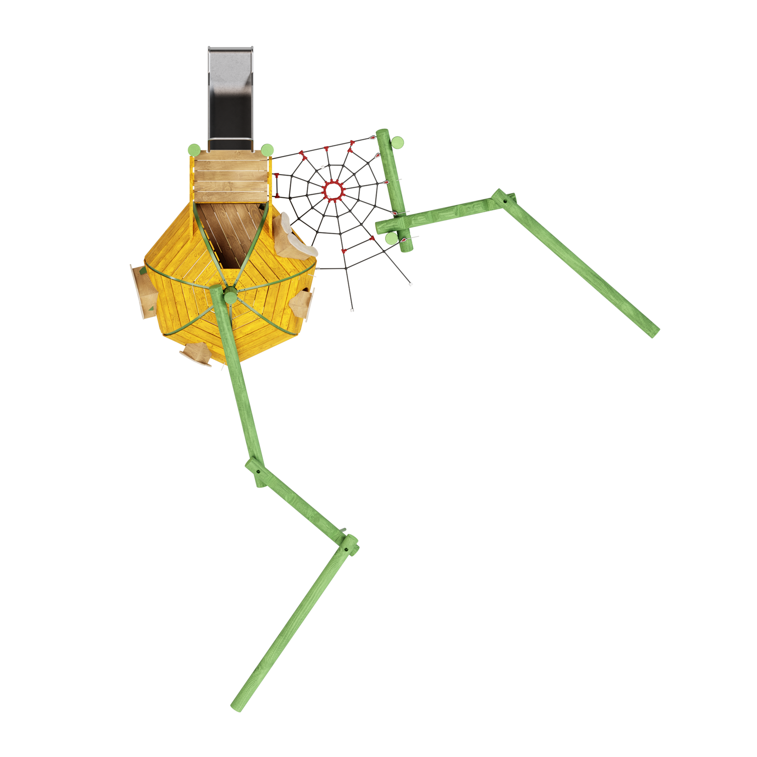 Каркас - сталь конструкционная, покрытие - цинкосодержащий грунт, окраска полимерным порошком или двухкомпонентной полиуретан-акриловой краской. Настил - дерево (массив), покрытие антисептиком и маслом в 2 слоя. Горка - сталь нержавеющая толщиной не менее 2 мм. Канатные сети, лазы - канат армированный 16 мм.