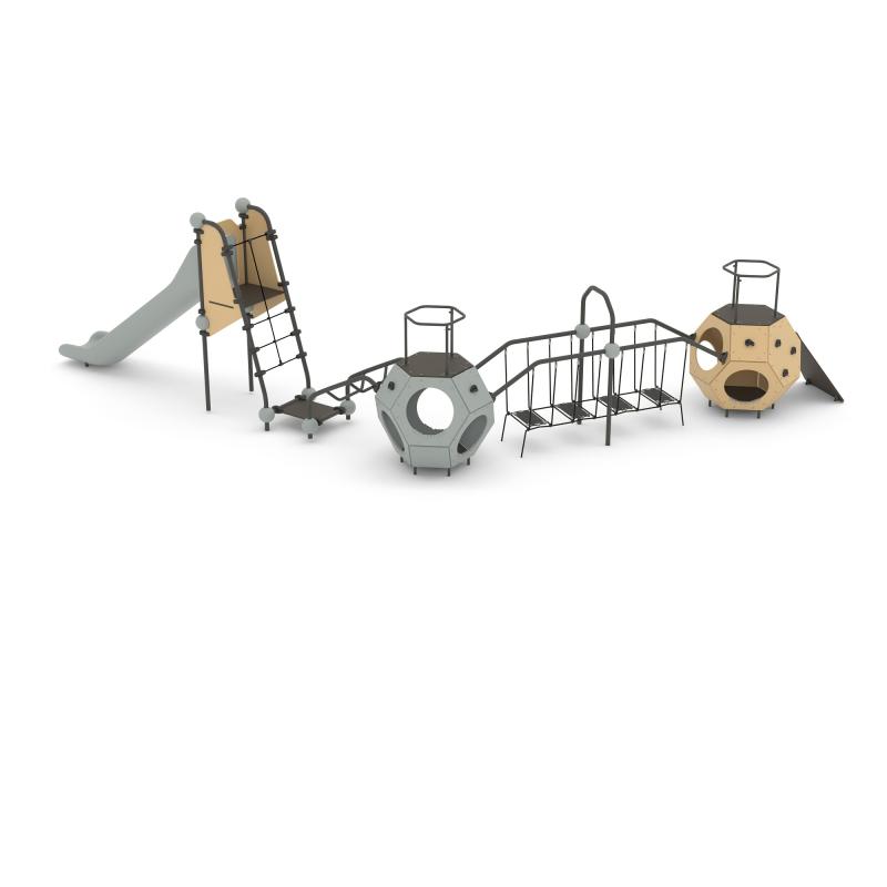 Игровой комплекс Romana 115.88.00 предназначен для детей 7-14 лет. Конструкция устанавливается в местах общего пользования, например на территории торгово-развлекательного комплекса или во дворах жилых домов. Игровой комплекс состоит из двух додекаэдров, соединительной лестницы и горки. Конструкция устойчивая, надежная и безопасная. Дети могут играть в подвижные игры не опасаясь испортить одежду и получить травму. Габариты конструкции: