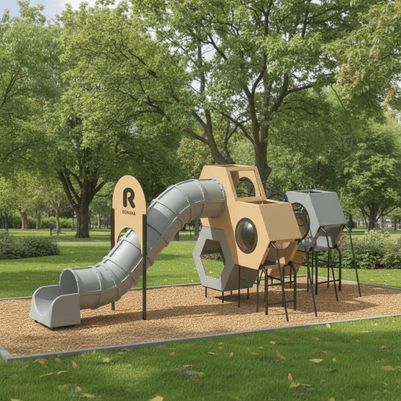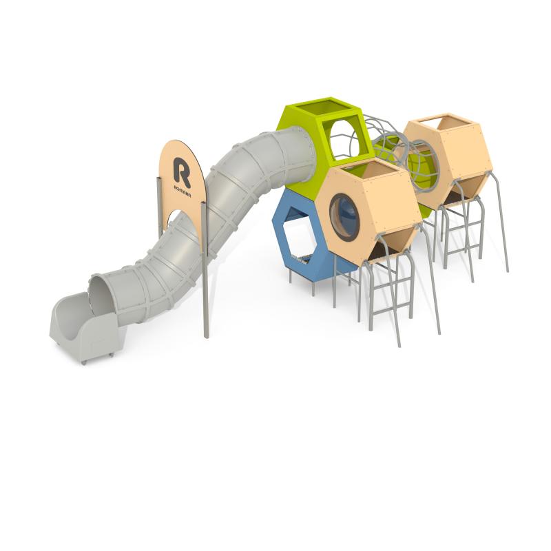 Спортивный игровой комплекс для улицы из фанеры и металла представляет собой прочную и безопасную конструкцию для активных игр на свежем воздухе. Он включает пять объемных шестигранников, соединенных переходами, а также горку и лазательные элементы. Для безопасности установлены ограждения. Они предотвращают случайные падения с высоты. Конструкция крепится с помощью бетонирования. Торцы труб и выступающие элементы снабжены защитными пластиковыми заглушками для предотвращения травм. Все крепежные элементы выполнены из антикоррозионных материалов. Металлические части окрашены полимерной порошковой эмалью, а фанерные элементы — краской на основе акрилата. Поэтому комплекс устойчив к погодным условиям и износу.