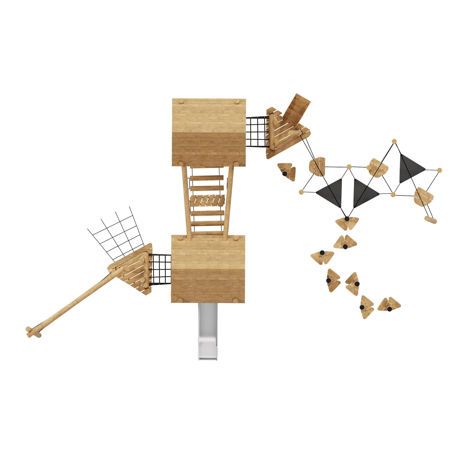 Каркас, обшивка – дерево, обработанное антисептиком и маслом террасным атмосферостойким для древесины. Канатные сети, лазы, ограждения - канат армированный 16 мм. Горки, скаты - сталь нержавеющая толщиной не менее 2 мм.