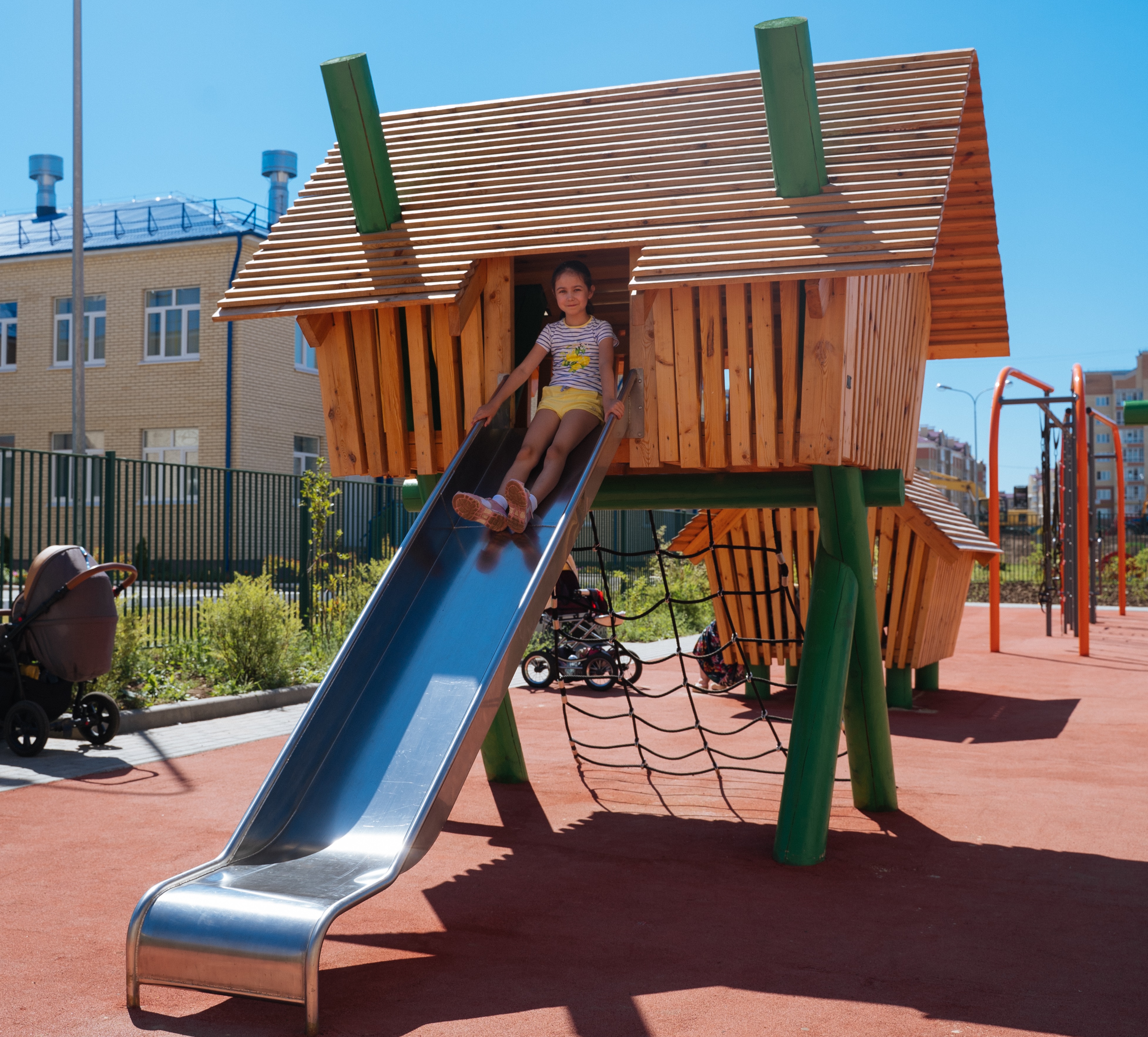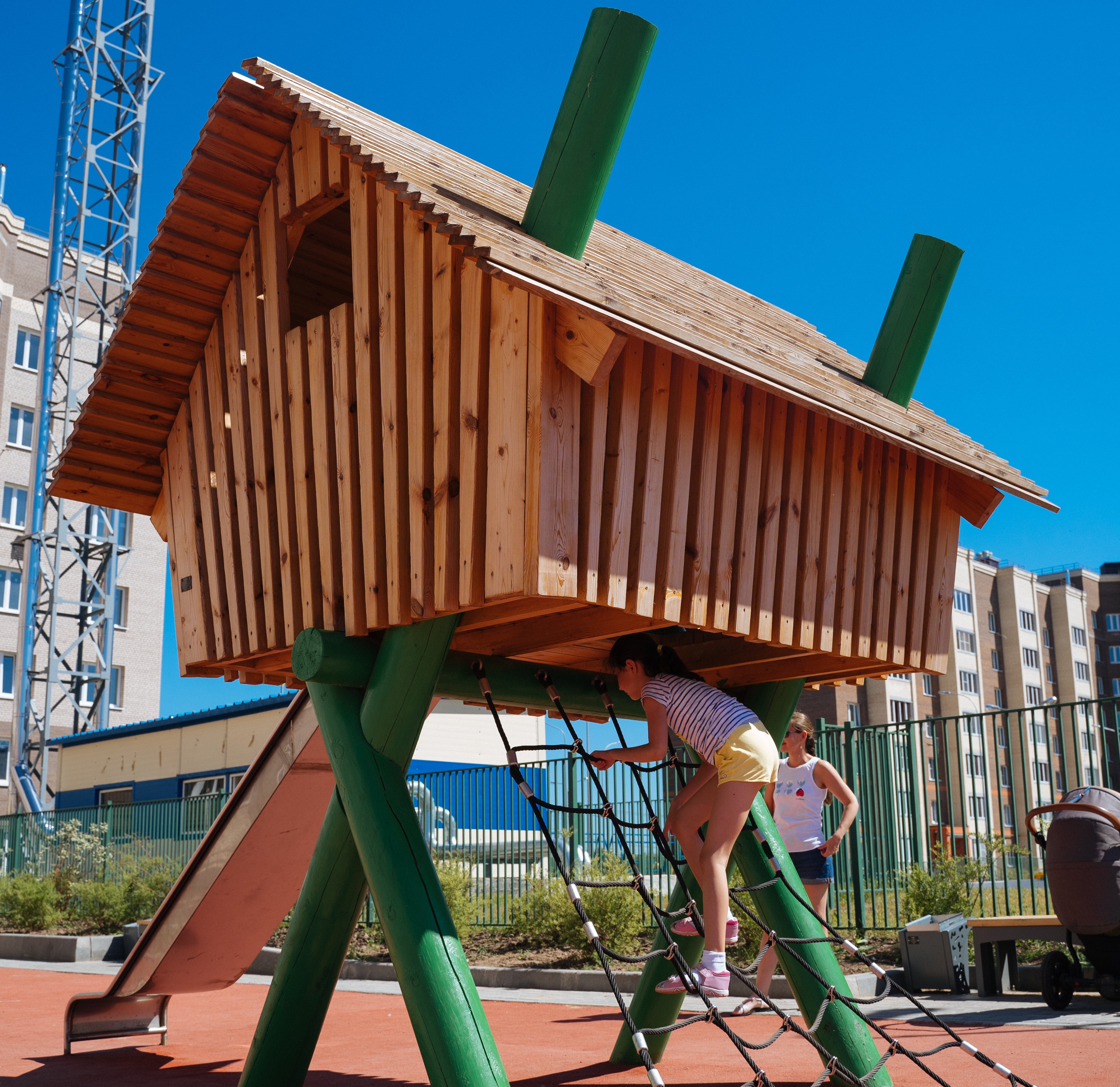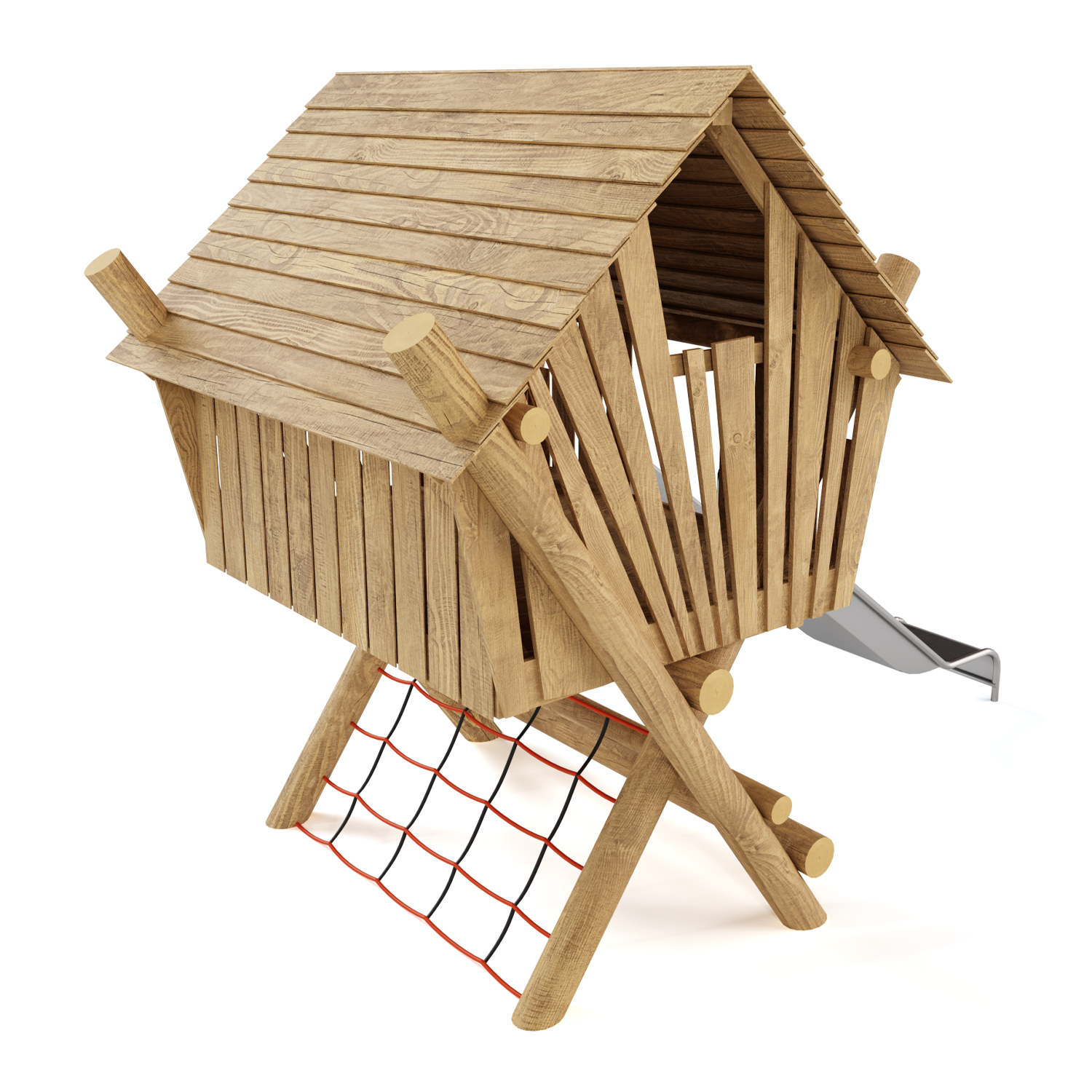 Каркас, обшивка - дерево, покрытие - антисептик, масло террасное атмосферостойкое или акриловая эмаль атмосферостойкая для древесины. Канатные сети, лазы, ограждения - канат армированный 16 мм. Горки, скаты - сталь нержавеющая толщиной не менее 2 мм, электрохимическая пассивация сварных швов.