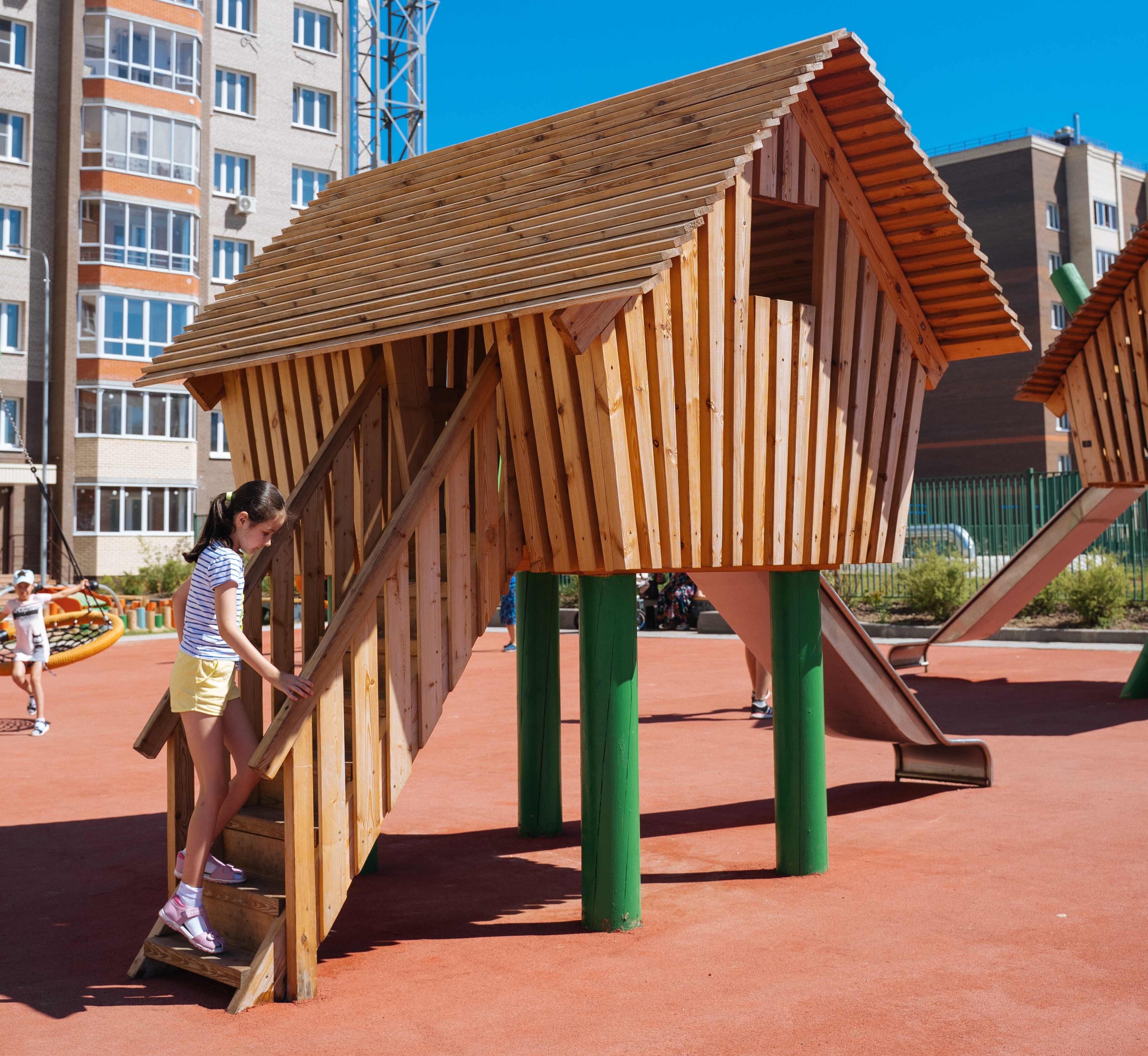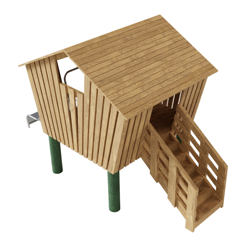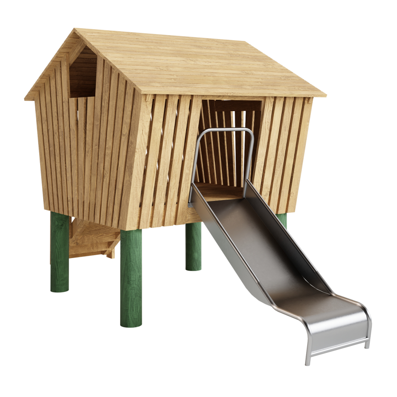 Каркас, обшивка - дерево, покрытие - антисептик, масло террасное атмосферостойкое или акриловая эмаль атмосферостойкая для древесины. Горки, скаты - сталь нержавеющая толщиной не менее 2 мм, электрохимическая пассивация сварных швов.