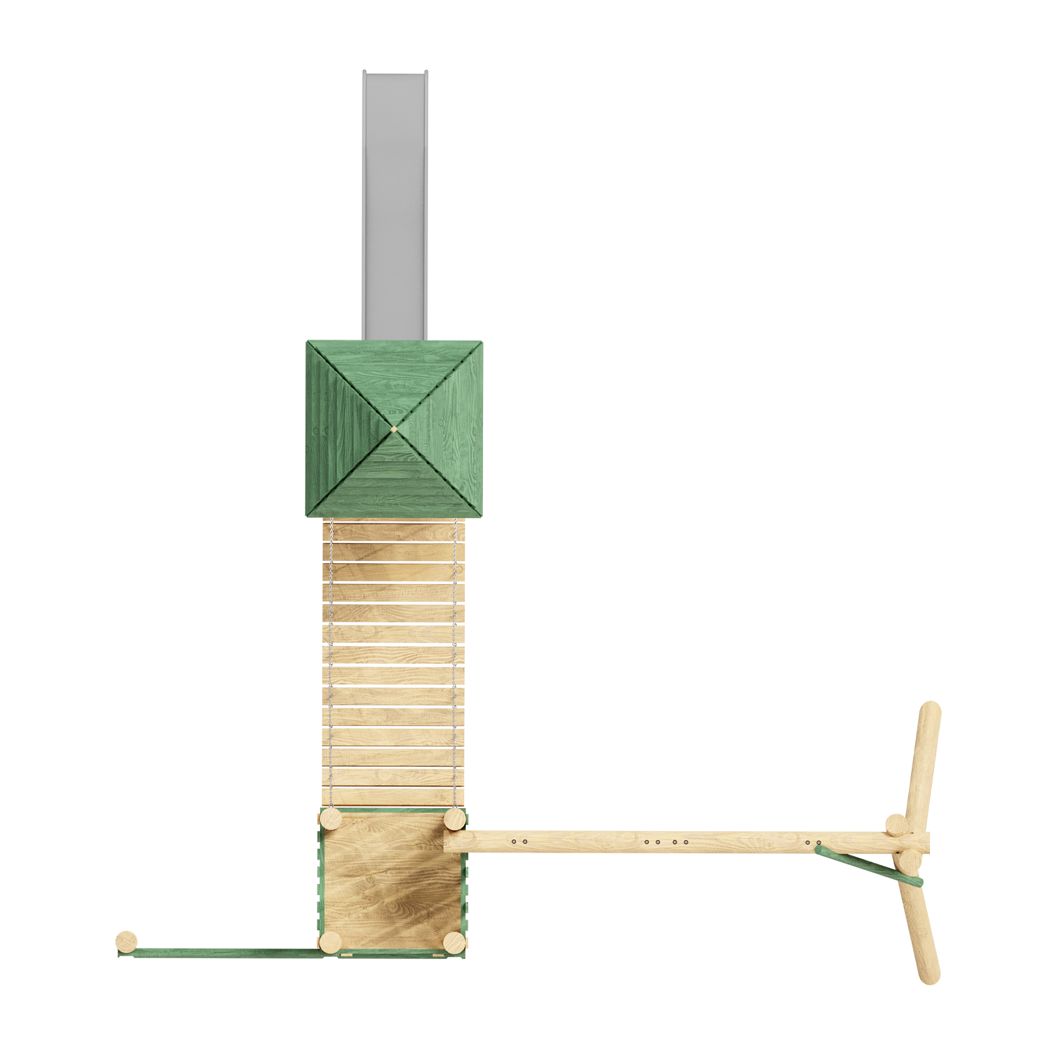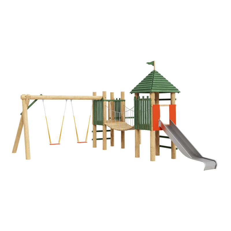 Каркас, обшивка – дерево, обработанное антисептиком и маслом террасным атмосферостойким для древесины. Горки, скаты - сталь нержавеющая толщиной не менее 2 мм, электрохимическая пассивация сварных швов. Подвесы - цепь оцинкованная. Сидение - металл, покрытый термоэластопластом.