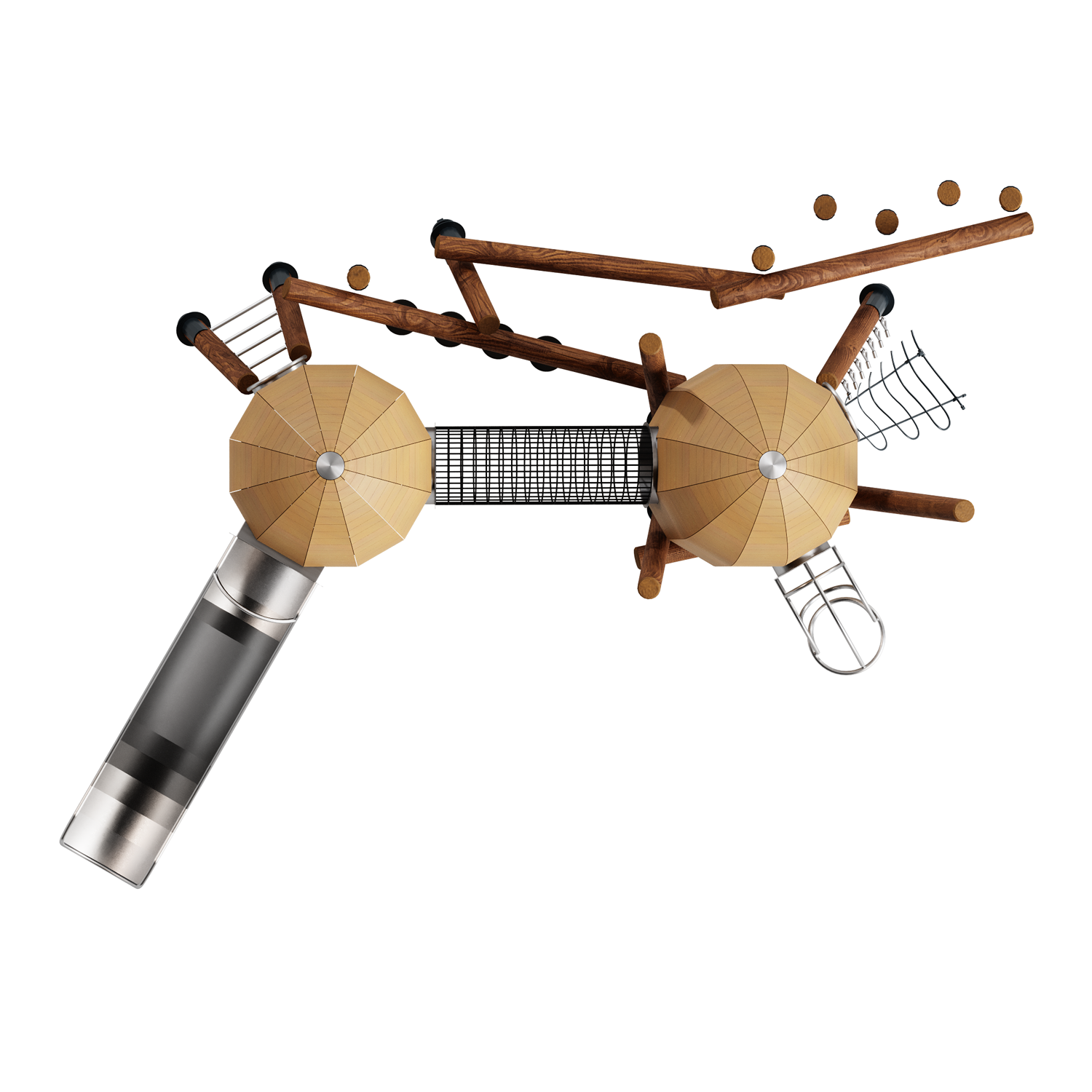 Каркас, обшивка – дерево, обработанное антисептиком и маслом террасным атмосферостойким для древесины. Горки - сталь нержавеющая. толщиной не менее 2 мм. Металлопрокат сталь Ст3, покрытие - цинкосодержащий грунт, порошковая окраска. Канатные сети, лазы - канат армированный 16 мм.
