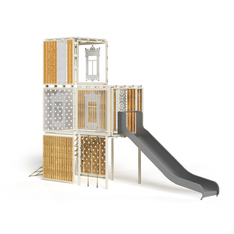 Каркас - металлопрокат сталь Ст3, покрытие - цинкосодержащий грунт, порошковая окраска (RAL по согласованию). Обшивка - дерево, покрытие - антисептик, масло террасное атмосферостойкое для древесины. Скаты - нержавеющая сталь. Панели HPL. Канатные сети, лазы, ограждения - канат армированный 16 мм. Декоративные части - монолитный поликарбонат не менее 3 мм.