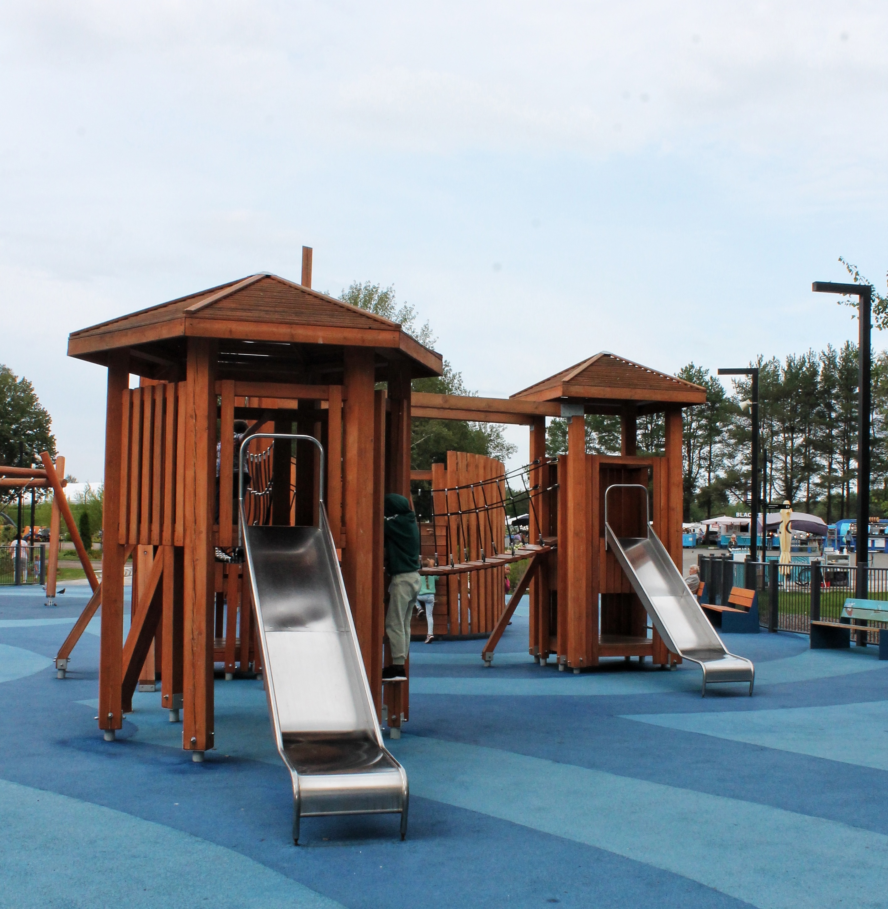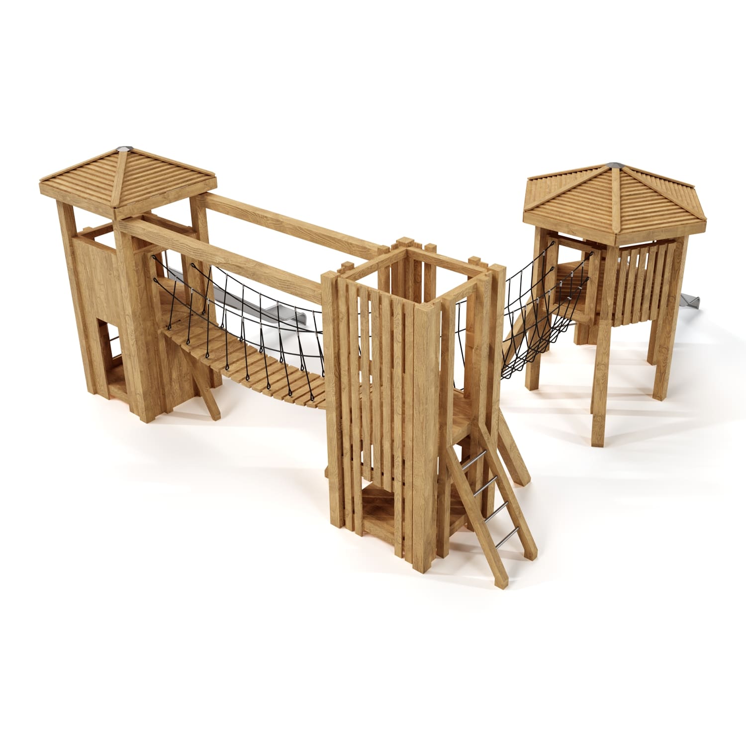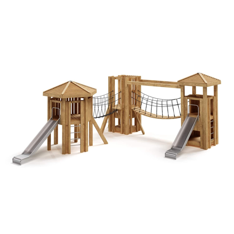Каркас, обшивка – дерево, обработанное антисептиком и маслом террасным атмосферостойким для древесины. Канатные сети, лазы, ограждения - канат армированный 16 мм. Горки, скаты - сталь нержавеющая толщиной не менее 2 мм.