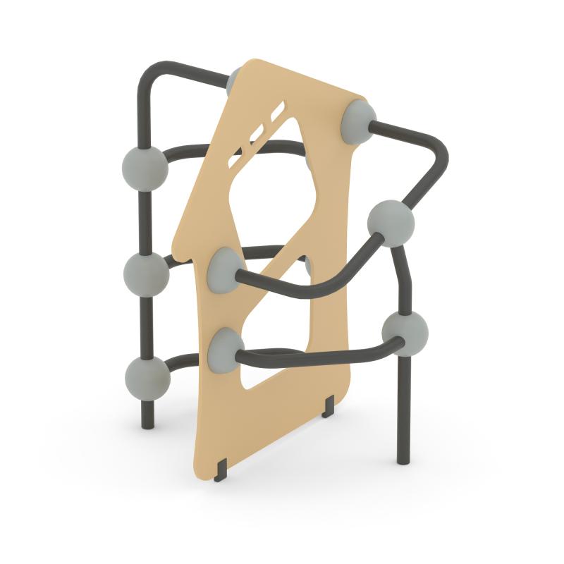 Конструкция обладает высокой ударопрочностью и виброустойчивостью. Во избежание травм и застревания одежды и частей тела, изделие разработано и изготовлено в соответствии с требованиями ГОСТ Р 52169-2012.Выполнен в виде металлических стоек из 057 трубы, фанеры в виде двухэтажного домика, скрепленных между собой сферами.
