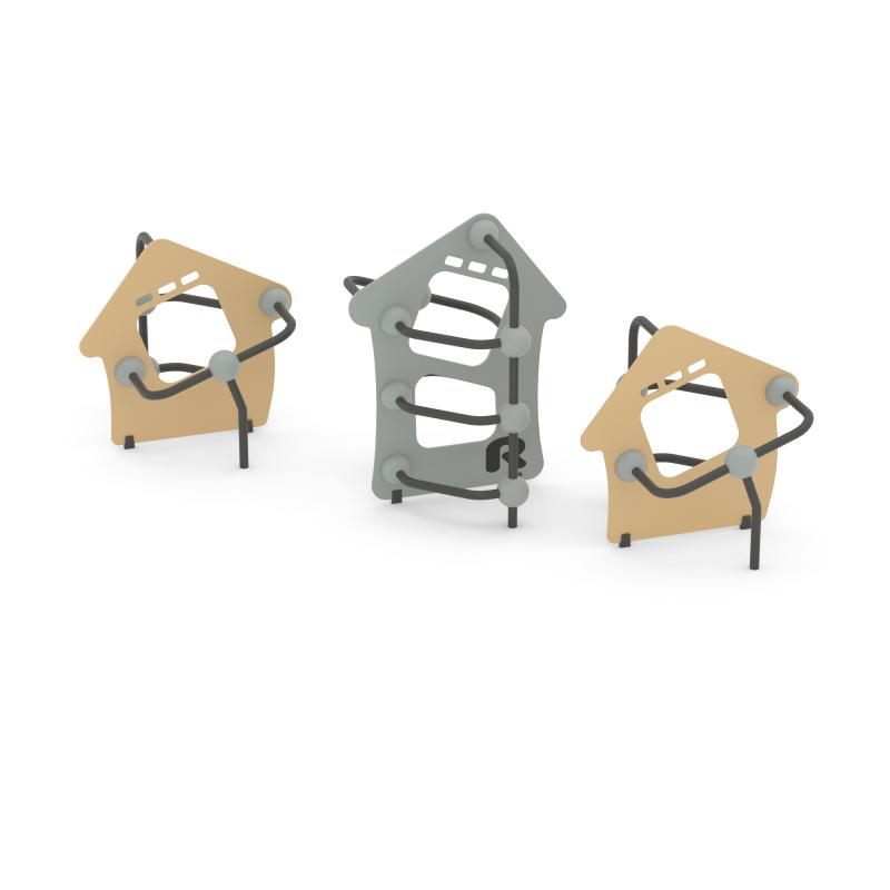 Конструкция обладает высокой ударопрочностью и виброустойчивостью. Во избежание травм и застревания одежды и частей тела, изделие разработано и изготовлено в соответствии с требованиями ГОСТ Р 52169-2012.Комплекс состоит из 3 элементов, каждый элемент выполнен в виде металлических стоек из 057 трубы, фанеры в виде домика, скрепленных между собой сферами.