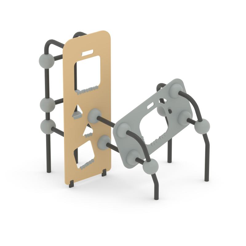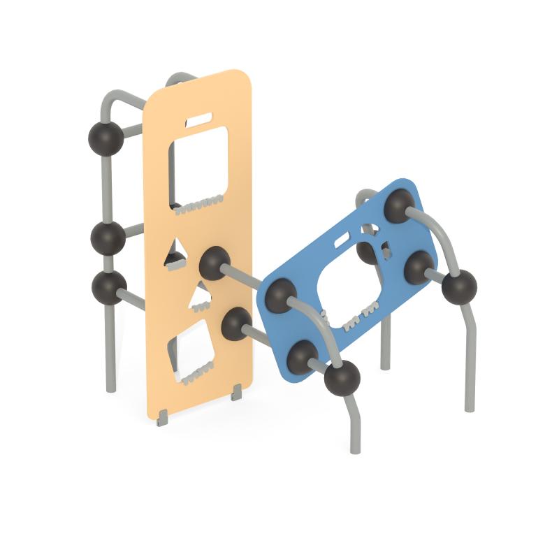 Конструкция обладает высокой ударопрочностью и виброустойчивостью. Во избежание травм и застревания одежды и частей тела, изделие разработано и изготовлено в соответствии с требованиями ГОСТ Р 52169-2012.Комплекс выполнен в виде металлических стоек из 057 трубы, фанеры, скрепленных между собой сферами.