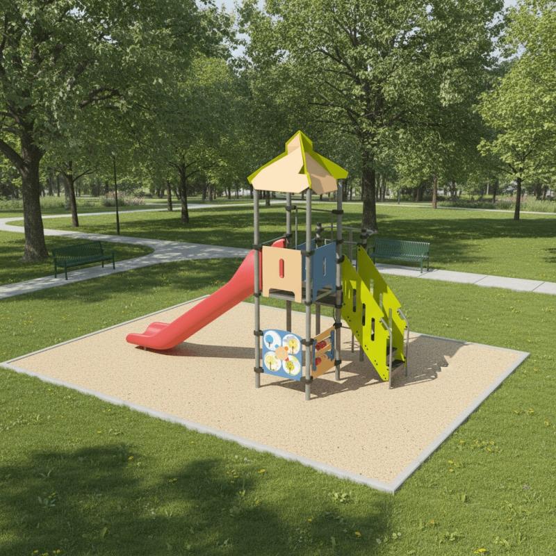 Игровой комплекс для тематических игр и физического развития предназначен для детей в возрасте от 4 лет. Изделие представляет собой сборно-разборную каркасную конструкцию из металлических труб, установленную на забетонированные стойки.Изделие устанавливается на открытых уличных участках, находящихся под контролем ответственного лица – эксплуатанта. Установка Изделия должна проводится на ровной площадке, свободной от насаждений. В зоне приземления должно быть ударопоглощающее покрытие (песок, древесные опилки) минимальной толщиной 300 мм.