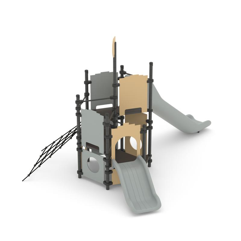 Игровой комплекс для тематических игр и физического развития предназначен для детей в возрасте от 4 лет. Изделие представляет собой сборно-разборную каркасную конструкцию из металлических труб, установленную на забетонированные стойки.Изделие устанавливается на открытых уличных участках, находящихся под контролем ответственного лица – эксплуатанта. Установка Изделия должна проводится на ровной площадке, свободной от насаждений. В зоне приземления должно быть ударопоглощающее покрытие (песок, древесные опилки) минимальной толщиной 300 мм