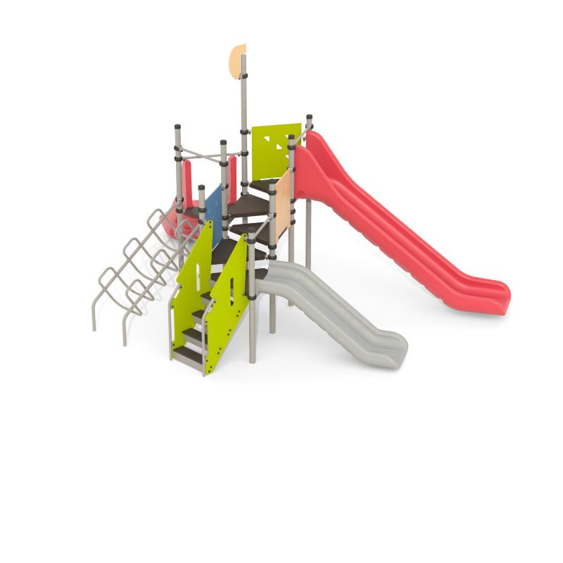 Игровой комплекс для тематических игр и физического развития предназначен для детей в возрасте от 4 лет. Изделие представляет собой сборно-разборную каркасную конструкцию из металлических труб, установленную на забетонированные стойки.Изделие устанавливается на открытых уличных участках, находящихся под контролем ответственного лица – эксплуатанта. Установка Изделия должна проводится на ровной площадке, свободной от насаждений. В зоне приземления должно быть ударопоглощающее покрытие (песок, древесные опилки) минимальной толщиной 300 мм