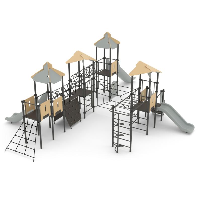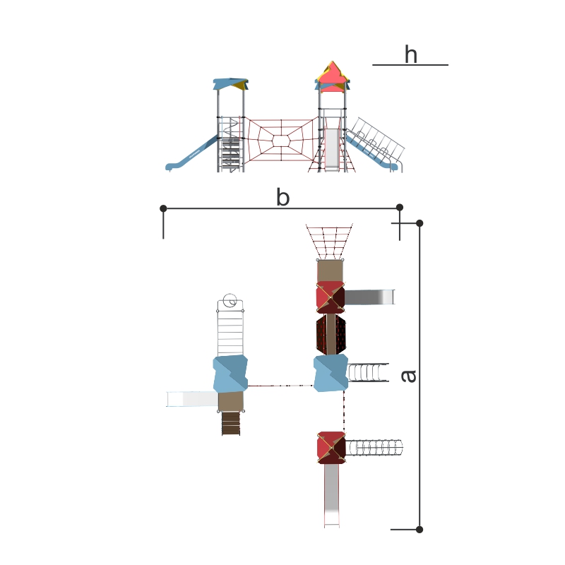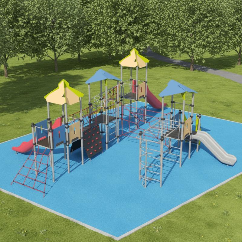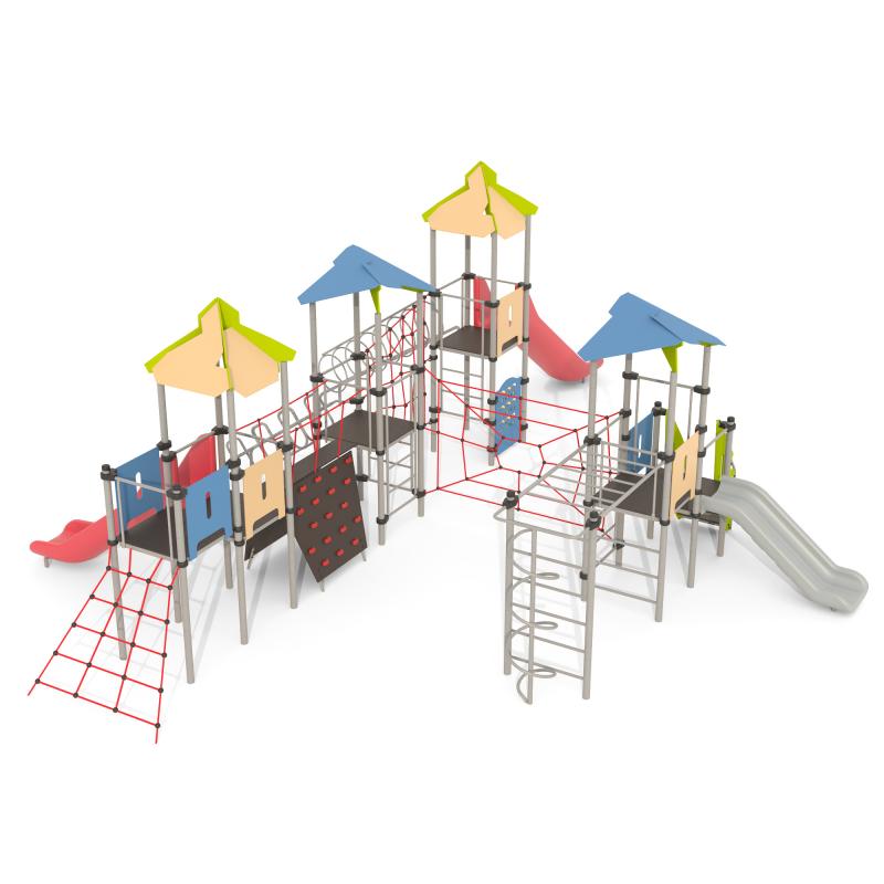 Игровой комплекс для тематических игр и физического развития предназначен для детей в возрасте от 8 лет. Изделие представляет собой сборно-разборную каркасную конструкцию из металлических труб, установленную на забетонированные стойки.Изделие устанавливается на открытых уличных участках, находящихся под контролем ответственного лица – эксплуатанта. Установка Изделия должна проводится на ровной площадке, свободной от насаждений. В зоне приземления должно быть ударопоглощающее покрытие (песок, древесные опилки) минимальной толщиной 300 мм.