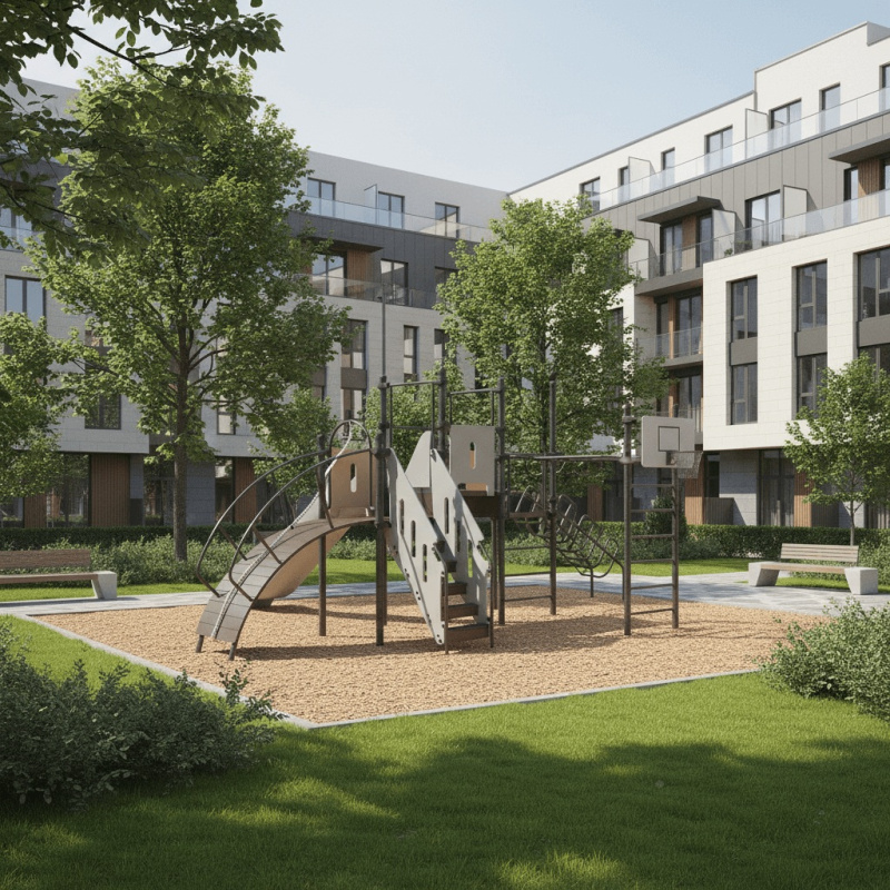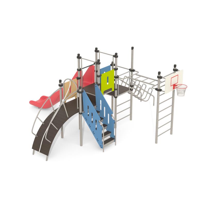 Игровой комплекс для тематических игр и физического развития предназначен для детей в возрасте от 8 лет. Изделие представляет собой сборно-разборную каркасную конструкцию из металлических труб, установленную на забетонированные стойки.Изделие устанавливается на открытых уличных участках, находящихся под контролем ответственного лица – эксплуатанта. Установка Изделия должна проводится на ровной площадке, свободной от насаждений. В зоне приземления должно быть ударопоглощающее покрытие (песок, древесные опилки) минимальной толщиной 300 мм.