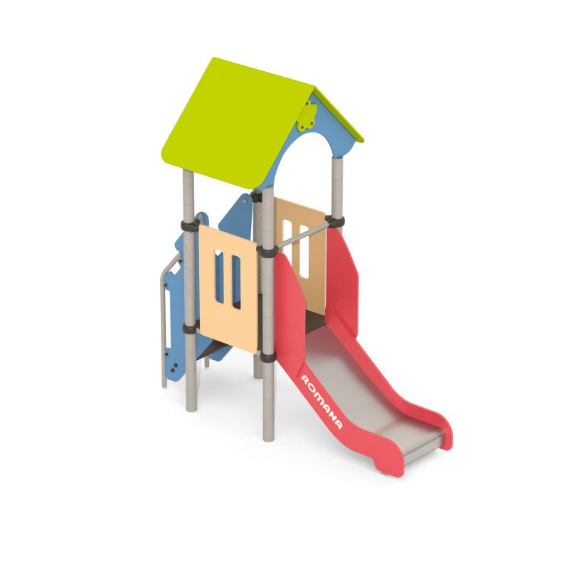 Детская площадка «Romana 104.03.00» - это небольшой домик-горка для малышей, которые впервые знакомятся с горкой. Может разместиться на дачном участке.Изделие устанавливается на открытых уличных участках, находящихся под контролем ответственного лица – эксплуатанта. Установка Изделия должна проводится на ровной площадке, свободной от насаждений. В зоне приземления должно быть ударопоглощающее покрытие (песок, древесные опилки) минимальной толщиной 300 мм.