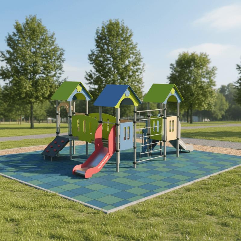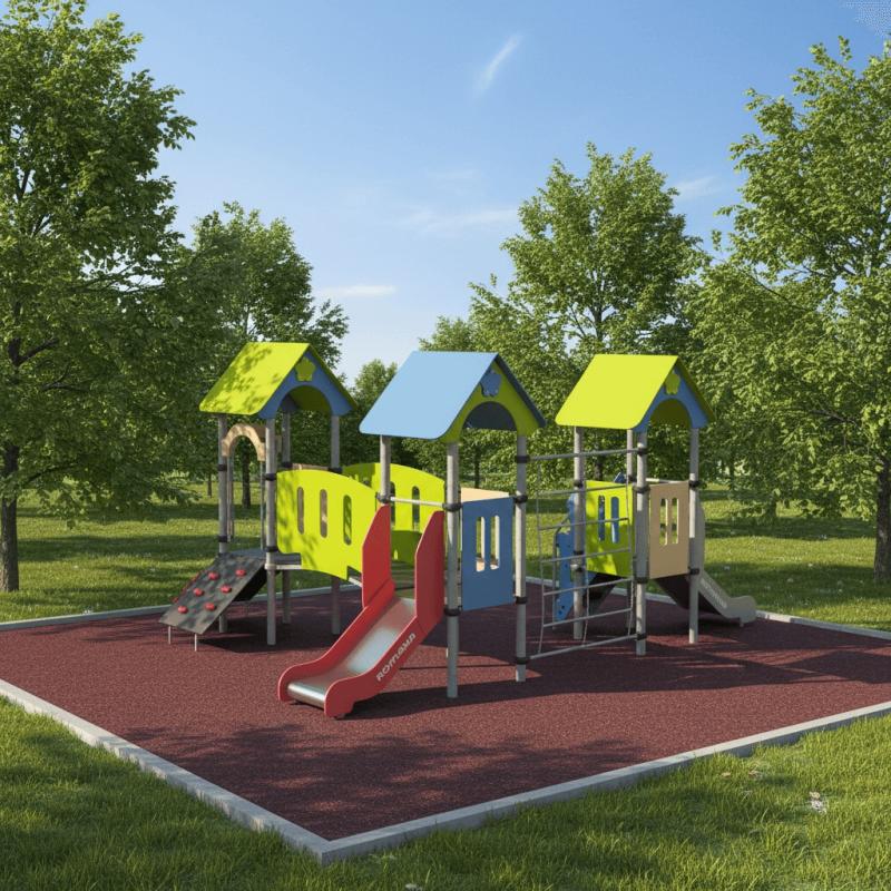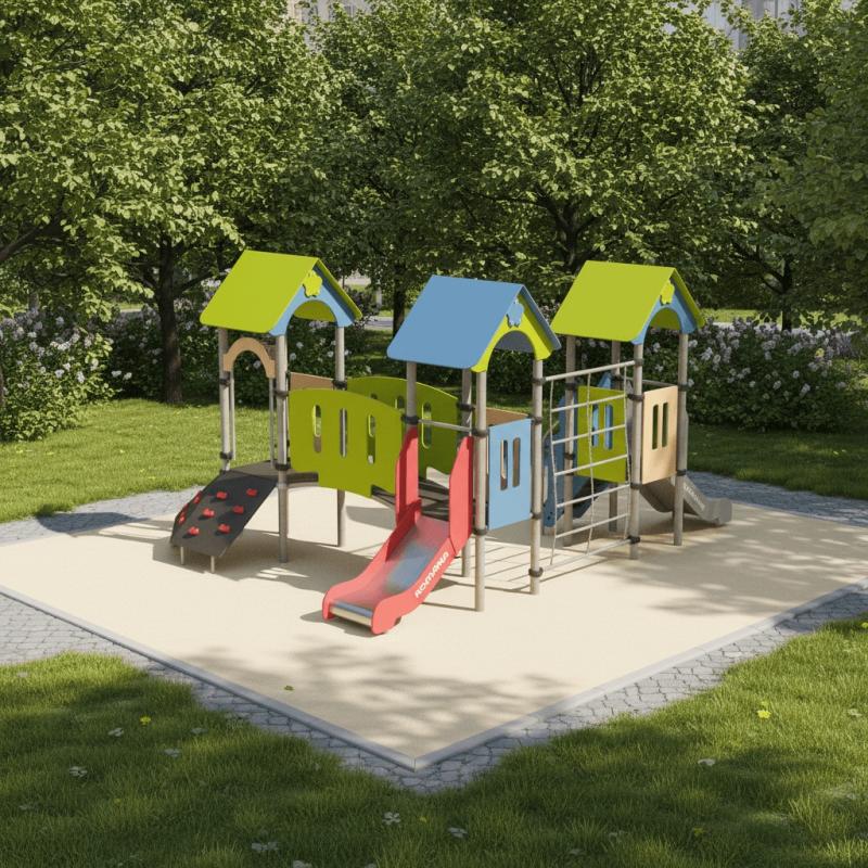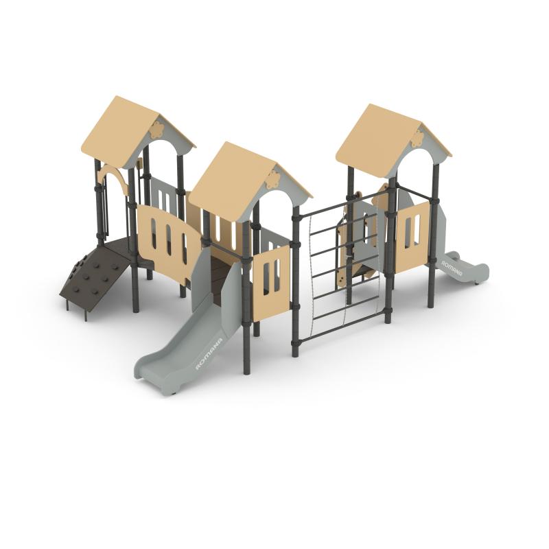 Детская площадка «Romana 104.12.00» - это игровой комплекс с домиками-горками, скалодромом, сеткой для лазанья. Помогает развивать у детей гибкость, ловкость и укреплять мышцы.Изделие устанавливается на открытых уличных участках, находящихся под контролем ответственного лица – эксплуатанта. Установка Изделия должна проводится на ровной площадке, свободной от насаждений. В зоне приземления должно быть ударопоглощающее покрытие (песок, древесные опилки) минимальной толщиной 300 мм.