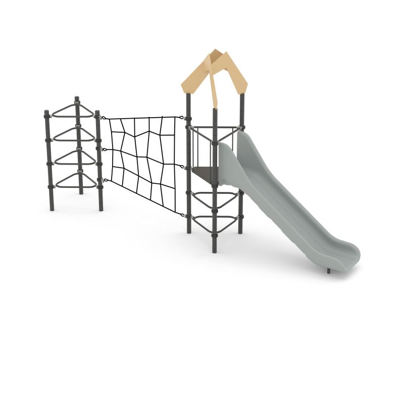 Спортивно - игровой комплекс для тематических игр и физического развития предназначен для детей в возрасте от 8 до 12 лет. Изделие представляет собой устойчивую конструкцию, обеспечивающую безопасные условия для занятий на открытом воздухе. Конструкция обладает высокой ударопрочностью и виброустойчивостью.Выполнен в виде металлических стоек, образующих треугольник, к стойкам прикреплены канатный лаз, горка.