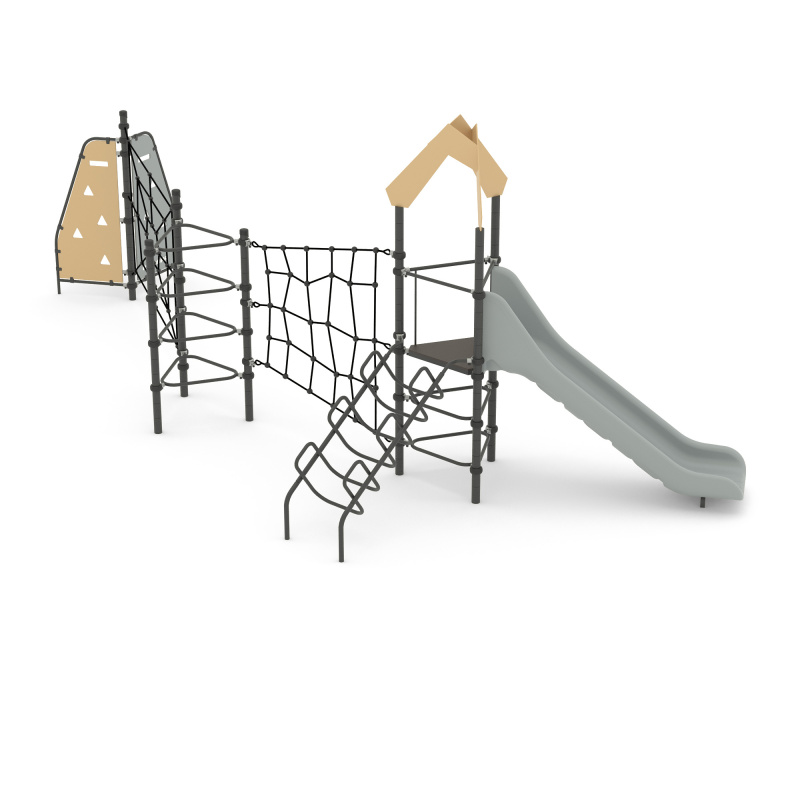 Спортивно - игровой комплекс для тематических игр и физического развития предназначен для детей в возрасте от 8 до 12 лет. Изделие представляет собой устойчивую конструкцию, обеспечивающую безопасные условия для занятий на открытом воздухе. Конструкция обладает высокой ударопрочностью и виброустойчивостью.Выполнен в виде металлических стоек, образующих треугольник, к стойкам прикреплены канатный лаз, панель-лаз, горка.