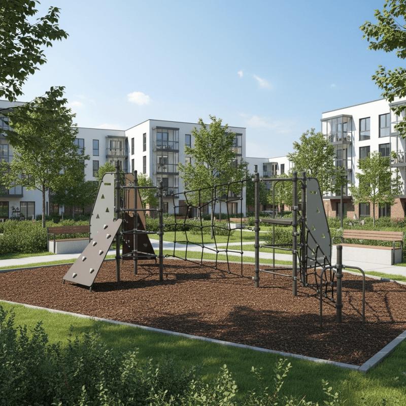 Спортивно - игровой комплекс для тематических игр и физического развития предназначен для детей в возрасте от 8 до 12 лет. Изделие представляет собой устойчивую конструкцию, обеспечивающую безопасные условия для занятий на открытом воздухе. Конструкция обладает высокой ударопрочностью и виброустойчивостью.Выполнен в виде металлических стоек, образующих треугольник, к стойкам прикреплены канатный лаз, панель-лаз, горка, трап.