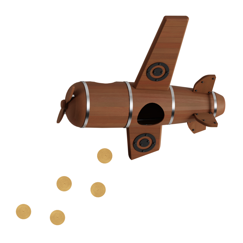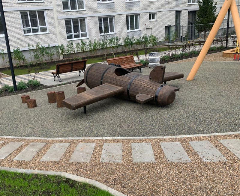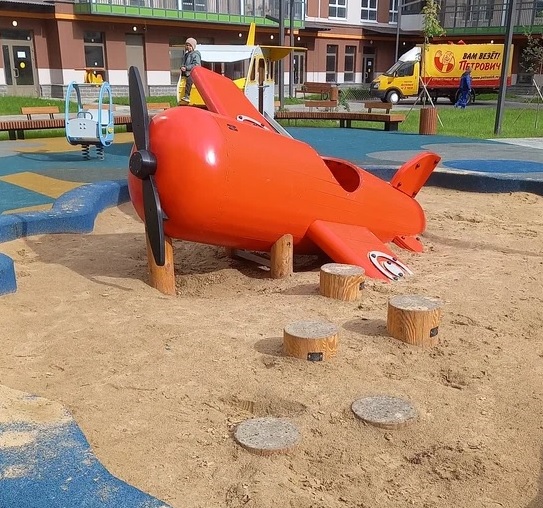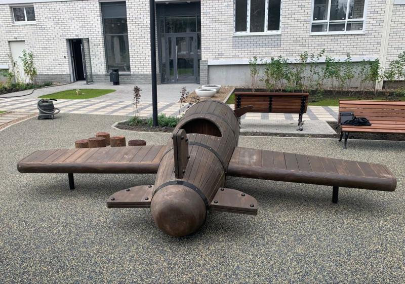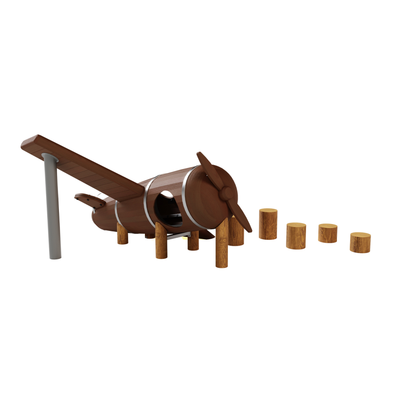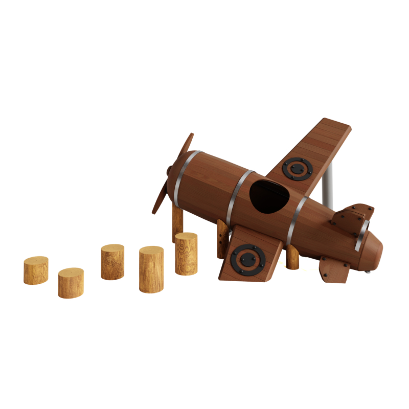 Каркас - сталь конструкционная, покрытие - цинкосодержащий грунт, окраска полимерным порошком или двухкомпонентной полиуретан-акриловой эмалью. Обшивка - дерево, обработанное антисептиком и маслом террасным атмосферостойким для древесины. Пропеллер самолета - имитация вращения. Пропеллер и декоративные элементы на крыльях – HPL.