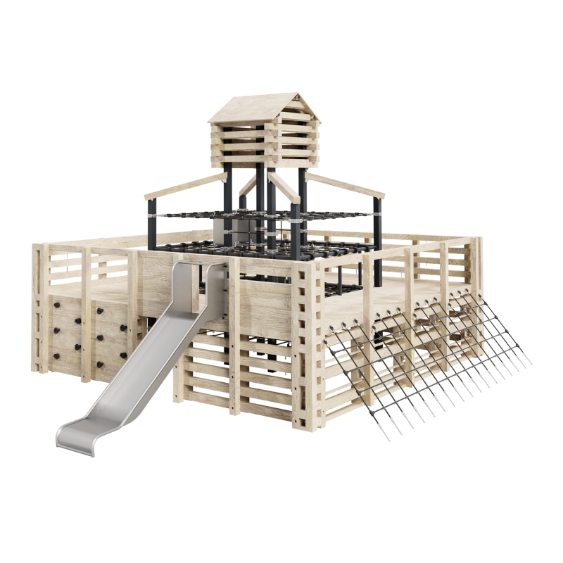 Каркас - сталь конструкционная, покрытие - цинкосодержащий грунт, окраска полимерным порошком или двухкомпонентной полиуретан-акриловой краской. Обшивка – дерево (массив), покрытие - антисептик, масло террасное атмосферостойкое для древесины. Горки, скаты - сталь нержавеющая толщиной не менее 2 мм. Канатные сети, лазы, ограждения - канат армированный 16 мм.