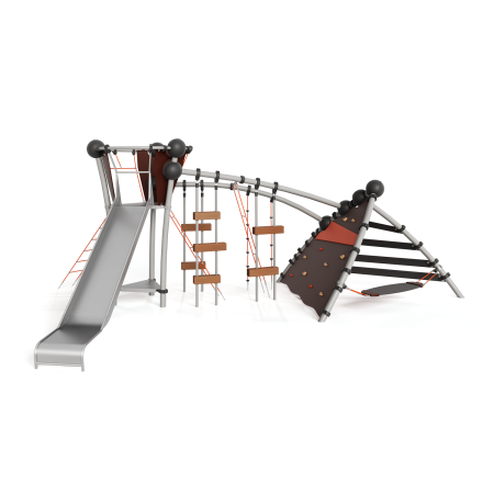Каркас - сталь конструкционная, покрытие - цинкосодержащий грунт, окраска полимерным порошком. Горка - сталь нержавеющая толщиной не менее 2 мм, электрохимическая пассивация сварных швов. Панели - полипропилен/HPL. Канатные сети, лазы, ограждения - канат армированный 16 мм. Зацепы для скалолазания - пескобетонный композит. Конвейерная лента. Отдельные элементы - лиственница (массив), обработанная антисептиком и маслом террасным атмосферостойким для древесины.