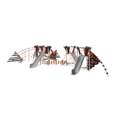 Каркас - сталь конструкционная, покрытие - цинкосодержащий грунт, окраска полимерным порошком. Горка - сталь нержавеющая толщиной не менее 2 мм, электрохимическая пассивация сварных швов. Панели - полипропилен/HPL. Канатные сети, лазы, ограждения - канат армированный 16 мм. Зацепы для скалолазания - пескобетонный композит. Конвейерная лента. Канат "Викинг".