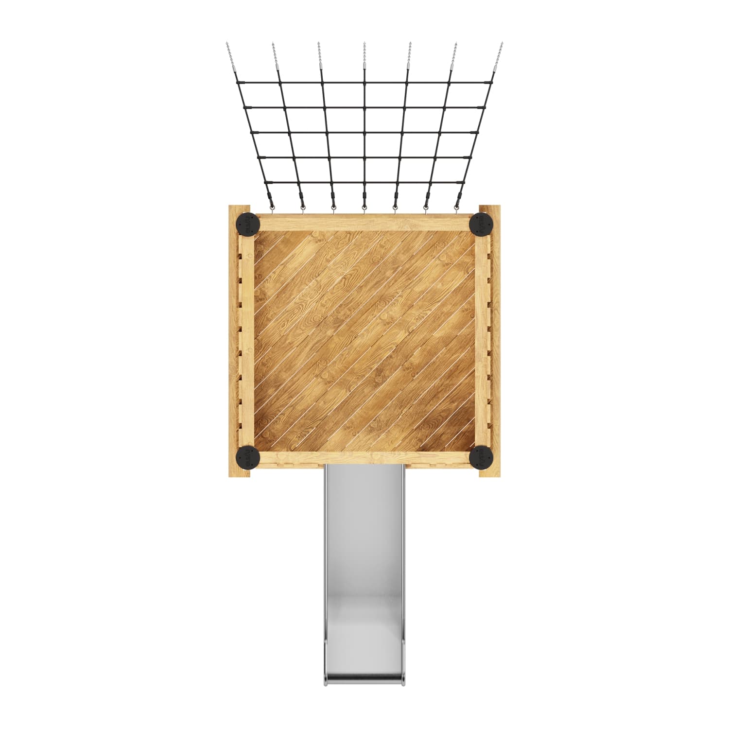 Каркас, обшивка - дерево, покрытие - антисептик, масло террасное атмосферостойкое или акриловая эмаль атмосферостойкая для древесины. Канатные сети, лазы, ограждения - канат армированный 16 мм. Горки, скаты - сталь нержавеющая толщиной не менее 2 мм, электрохимическая пассивация сварных швов.