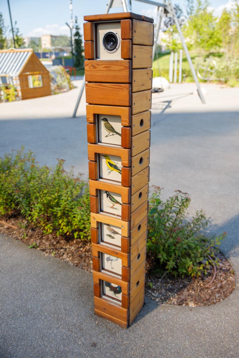 Изделие представляет собой конструкцию из металлического каркаса и деревянной обшивки. На изделии предусмотрены подсвечиваемые окошки с изображением птиц и звуковое сопровождение. Каркас - сталь конструкционная, покрытие - цинкосодержащий грунт, порошковое окрашивание. Древесина обработана антисептиком и атмосферостойким маслом для древесины.