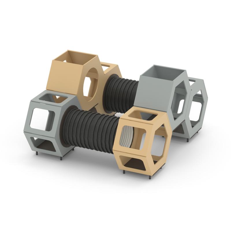 Игровой модуль для тематических игр и физического развития предназначен для детей в возрасте от 4 до 8 лет. Изделие должно представлять собой устойчивую конструкцию, обеспечивающую безопасные условия для занятий на открытом воздухе. Конструкция должна обладать высокой ударопрочностью и виброустойчивостью.В сборе представляет собой конструкцию в виде двух секций из трех шестигранных игровых элементов в сборе, четыре нижних из которых попарно соединены между собой лазом-трубой гофрированной. Четыре нижних элемента установлены на грунтозацепы.