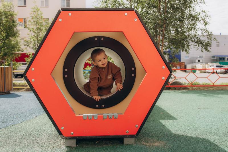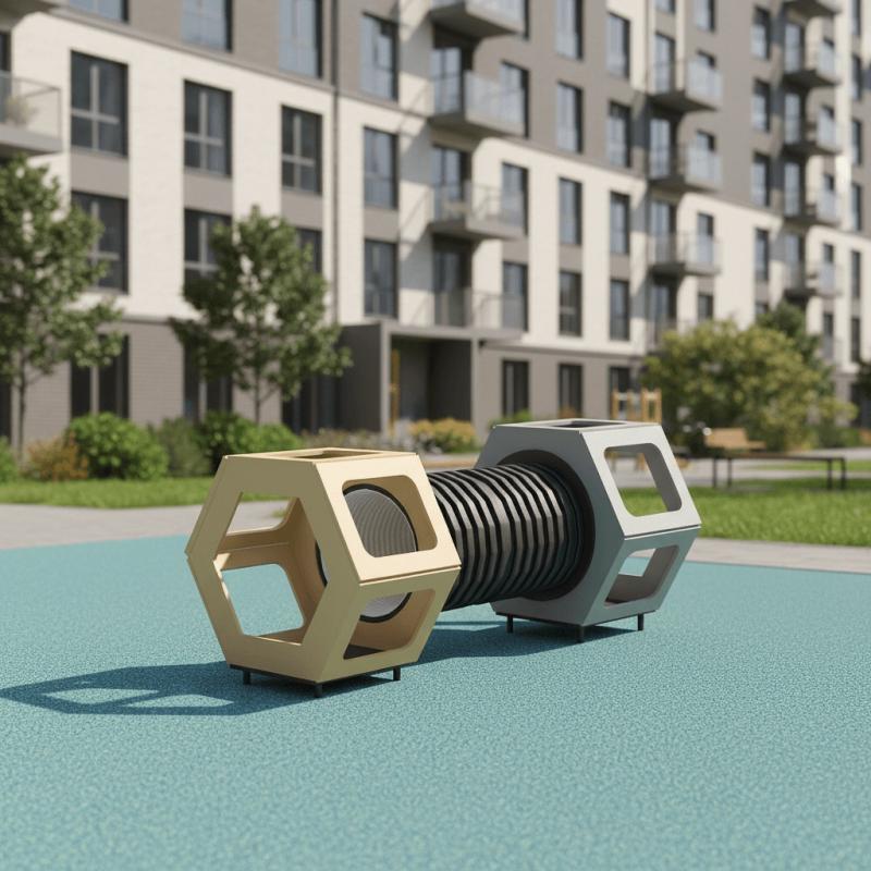 Игровой модуль для тематических игр и физического развития предназначен для детей в возрасте от 4 до 8 лет. Изделие должно представлять собой устойчивую конструкцию, обеспечивающую безопасные условия для занятий на открытом воздухе. Конструкция должна обладать высокой ударопрочностью и виброустойчивостью.В сборе представляет собой конструкцию в виде двух шестигранных игровых элементов, соединенных между собой лазом-трубой гофрированной. Установлен на грунтозацепы.
