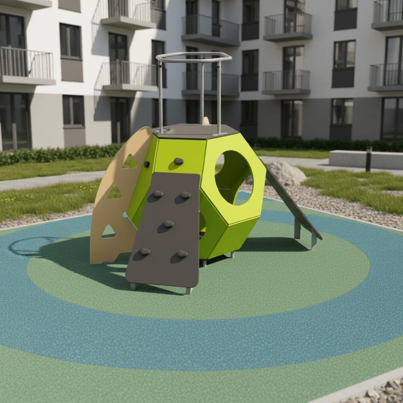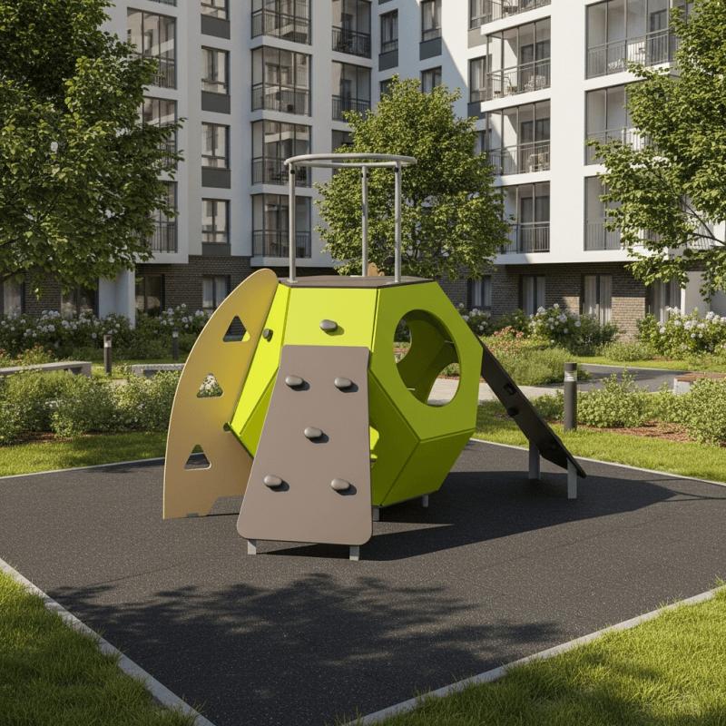 Игровой модуль для тематических игр и физического развития предназначен для детей в возрасте от 8 до 12 лет. Изделие должно представлять собой устойчивую конструкцию, обеспечивающую безопасные условия для занятий на открытом воздухе. Конструкция должна обладать высокой ударопрочностью и виброустойчивостью.В сборе представляет собой конструкцию в виде игрового элемента в виде «усеченного октаэдра», установленного на грунтозацепы.