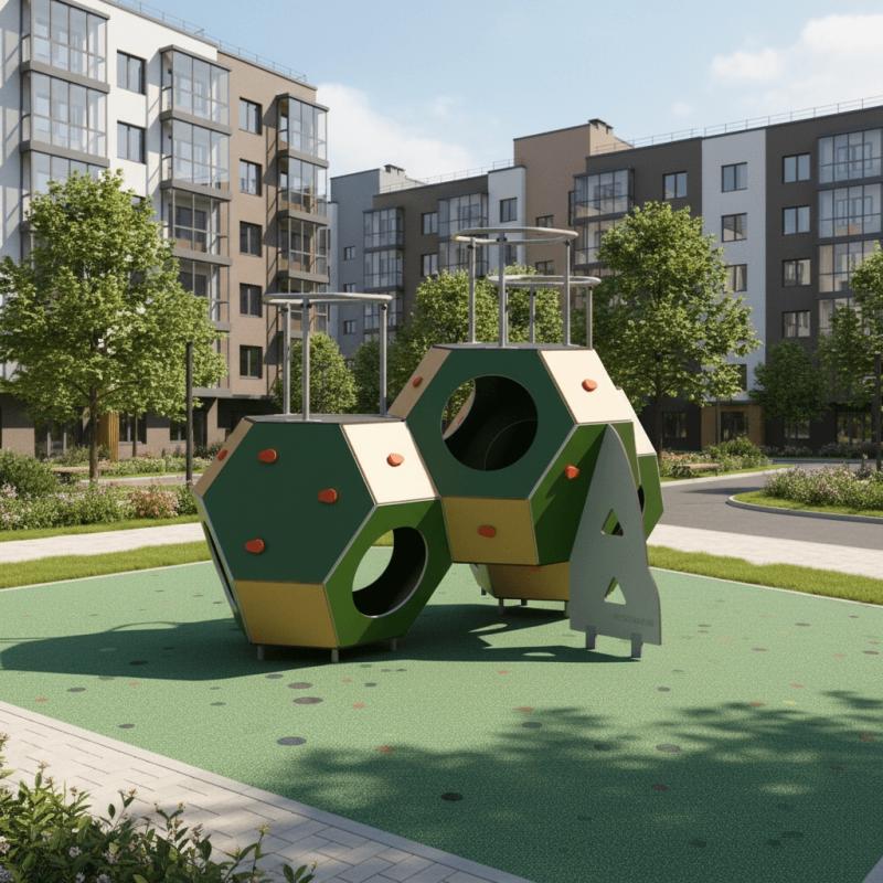 Romana 115.17.10 – игровой комплекс для возрастной группы 8-12 лет. Игровая конструкция состоит из трех усеченных октаэдров, ограждения и панели «упор». Крепится в грунт с помощью грунтозацепа и бетонируется. Игровой комплекс надежный, устойчивый и безопасный. Его шестигранные панели ударопрочные, выполнены из качественного пластика (ПНД) толщиной 19 мм. Все другие детали также изготовлены из пластика (ПНД) толщиной 19 мм. Наверху каждого октаэдра имеются пластиковые приспособления для лазанья. Игровой комплекс может устанавливаться во дворах домов, на игровых площадках, на территории торгово-развлекательных комплексов. Можно эксплуатировать круглогодично – при соблюдении техники безопасности и под контролем взрослых.