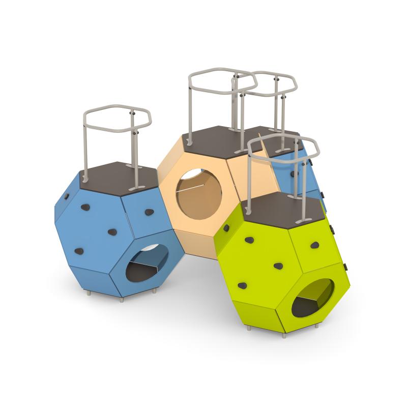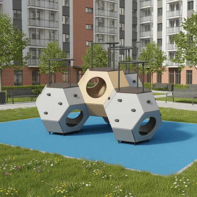 Игровой модуль для тематических игр и физического развития предназначен для детей в возрасте от 8 до 12 лет. Изделие должно представлять собой устойчивую конструкцию, обеспечивающую безопасные условия для занятий на открытом воздухе. Конструкция должна обладать высокой ударопрочностью и виброустойчивостью.В сборе представляет собой конструкцию в виде четырех игровых элементов в виде «усеченного октаэдра», один из которых располагается выше, а остальные три присоединены к шестигранной панели и расположены в плане под углом 120 градусов. Три нижних элемента установлены на грунтозацепы.
