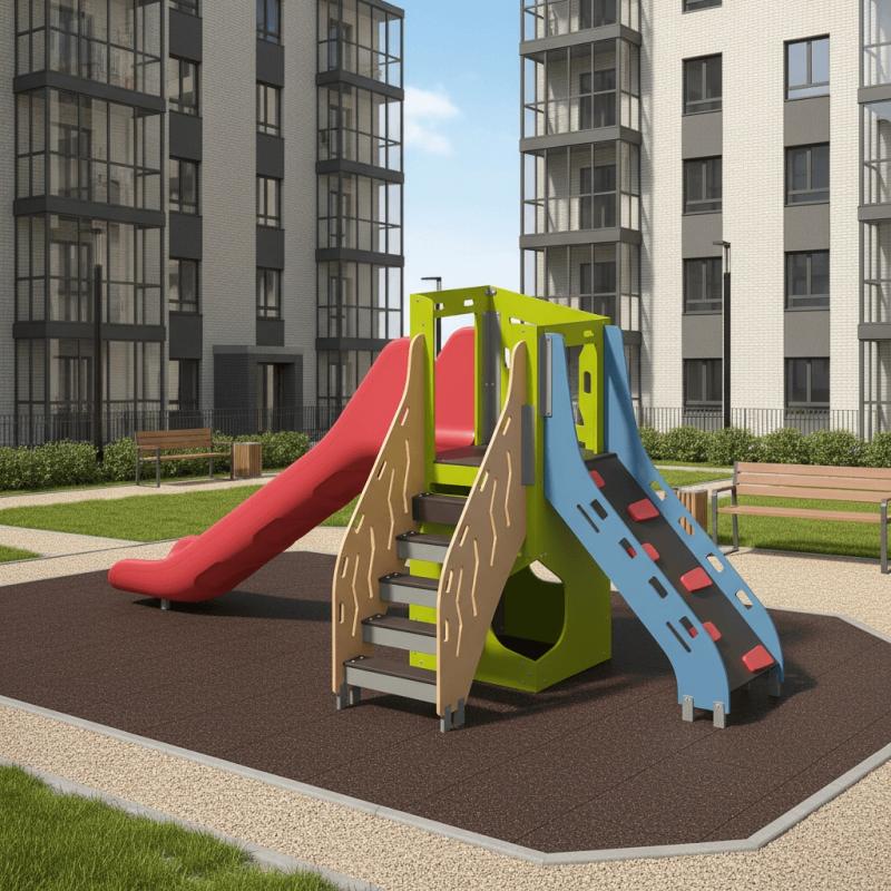 Игровой модуль для тематических игр и физического развития предназначен для детей в возрасте от 4 до 12 лет. Изделие должно представлять собой устойчивую конструкцию, обеспечивающую безопасные условия для занятий на открытом воздухе. Конструкция должна обладать высокой ударопрочностью и виброустойчивостью.В сборе представляет собой конструкцию в виде прямоугольного комплекса-башни по центру, к которому с трех сторон присоединены: лестница, горка 1250 мм и лаз напротив горки.Изделие устанавливается на открытых уличных участках, находящихся под контролем ответственного лица – эксплуатанта. Установка Изделия должна проводится на ровной площадке, свободной от насаждений. В зоне приземления должно быть ударопоглощающее покрытие (песок, древесные опилки) минимальной толщиной 300 мм.