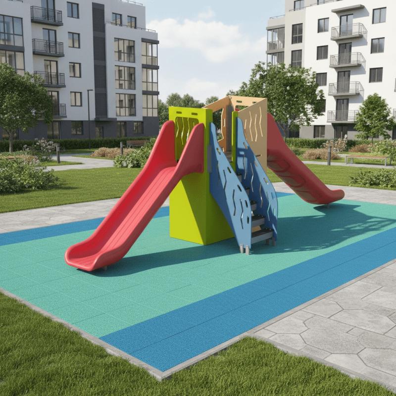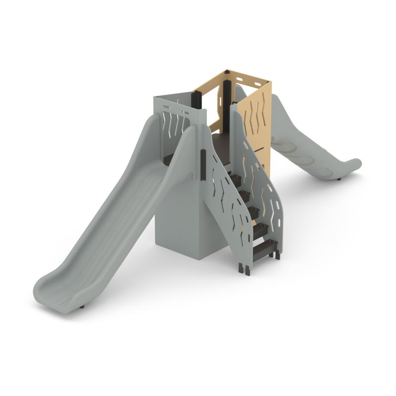 Игровой модуль для тематических игр и физического развития предназначен для детей в возрасте от 8 до 12 лет. Изделие должно представлять собой устойчивую конструкцию, обеспечивающую безопасные условия для занятий на открытом воздухе. Конструкция должна обладать высокой ударопрочностью и виброустойчивостью.В сборе представляет собой конструкцию в виде двух прямоугольных комплексов-башен по центру (сдвоенная башня), к которым с двух противоположных сторон прикреплены горки 1250 мм и с одной стороны прикреплена лестница.Изделие устанавливается на открытых уличных участках, находящихся под контролем ответственного лица – эксплуатанта. Установка Изделия должна проводится на ровной площадке, свободной от насаждений. В зоне приземления должно быть ударопоглощающее покрытие (песок, древесные опилки) минимальной толщиной 300 мм.