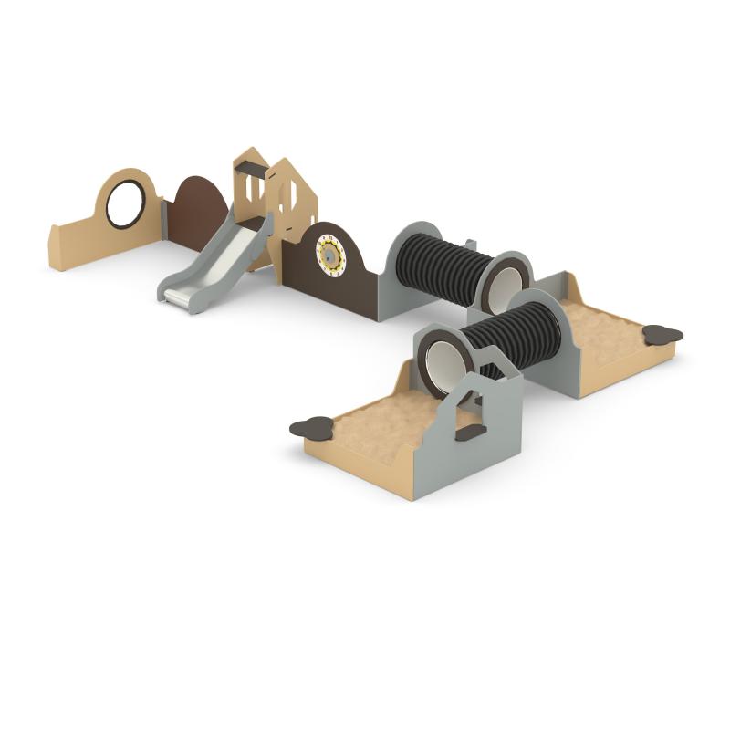 Игровой модуль для тематических игр и физического развития предназначен для детей в возрасте от 3 до 8 лет. Изделие должно представлять собой устойчивую конструкцию, обеспечивающую безопасные условия для занятий на открытом воздухе. Конструкция должна обладать высокой ударопрочностью и виброустойчивостью.В сборе представляет собой конструкцию в виде песочницы, которая присоединена к песочнице-домику и домику игровому посредством соединений в виде труб гофрированных, также присоединена горка.Изделие устанавливается на открытых уличных участках, находящихся под контролем ответственного лица – эксплуатанта. Установка Изделия должна проводится на ровной площадке, свободной от насаждений. В зоне приземления должно быть ударопоглощающее покрытие (песок, древесные опилки) минимальной толщиной 300 мм.