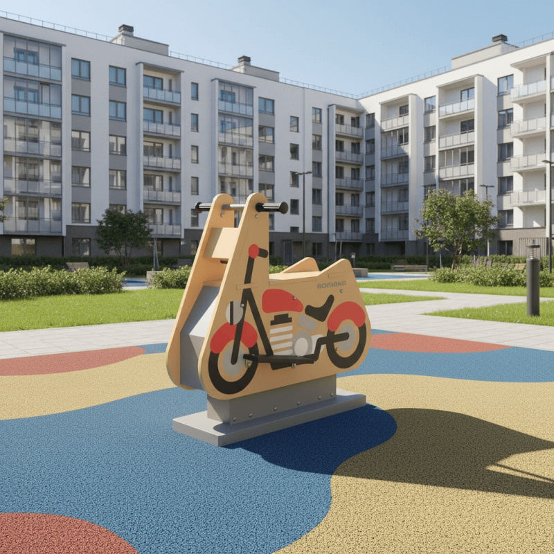 Качалка для тематических игр, предназначена для детей в возрасте от 2 лет. На фигурную вставку при помощи УФ-печати нанесено изображение в тематике «мотоцикл».Конструкция качалки предоставляет возможность качаться пользователю по оси «вперед-назад». Изделие приходит в движение за счет переноса веса ребенка - совершения раскачивающих движений «назад-вперед». Платформа обеспечивает плавное легкое качание, без ударов и усилий.