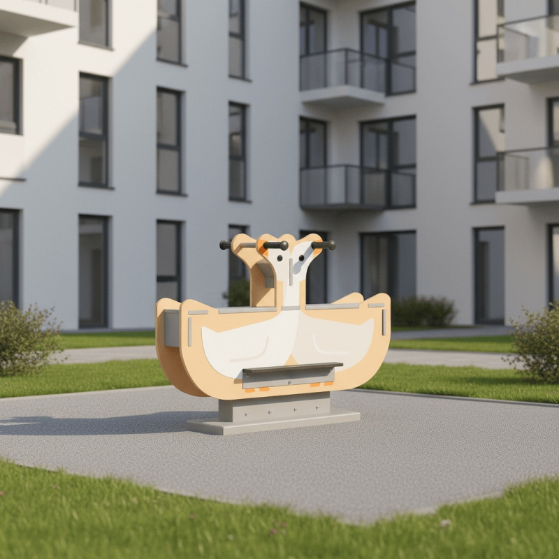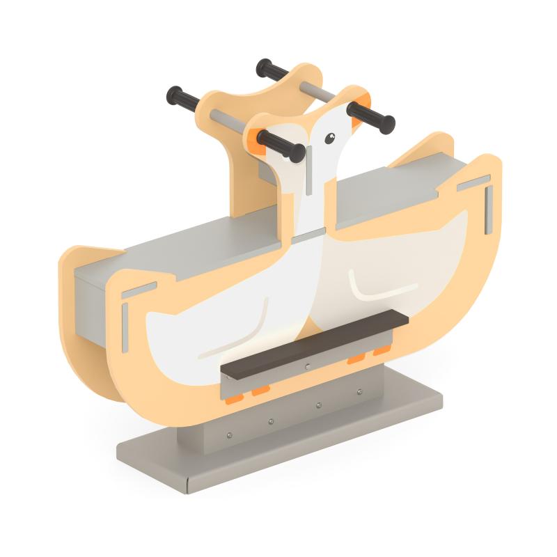 Качалка для тематических игр, предназначена для детей в возрасте от 2 лет, двухместная. На фигурную вставку при помощи УФ-печати нанесено изображение в тематике «гуси».Конструкция качалки предоставляет возможность качаться пользователю по оси «вперед-назад». Изделие приходит в движение за счет переноса веса ребенка - совершения раскачивающих движений «назад-вперед». Платформа обеспечивает плавное легкое качание, без ударов и усилий.