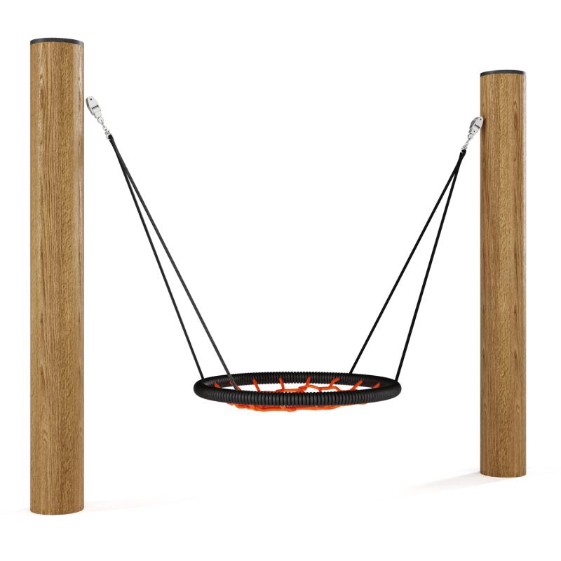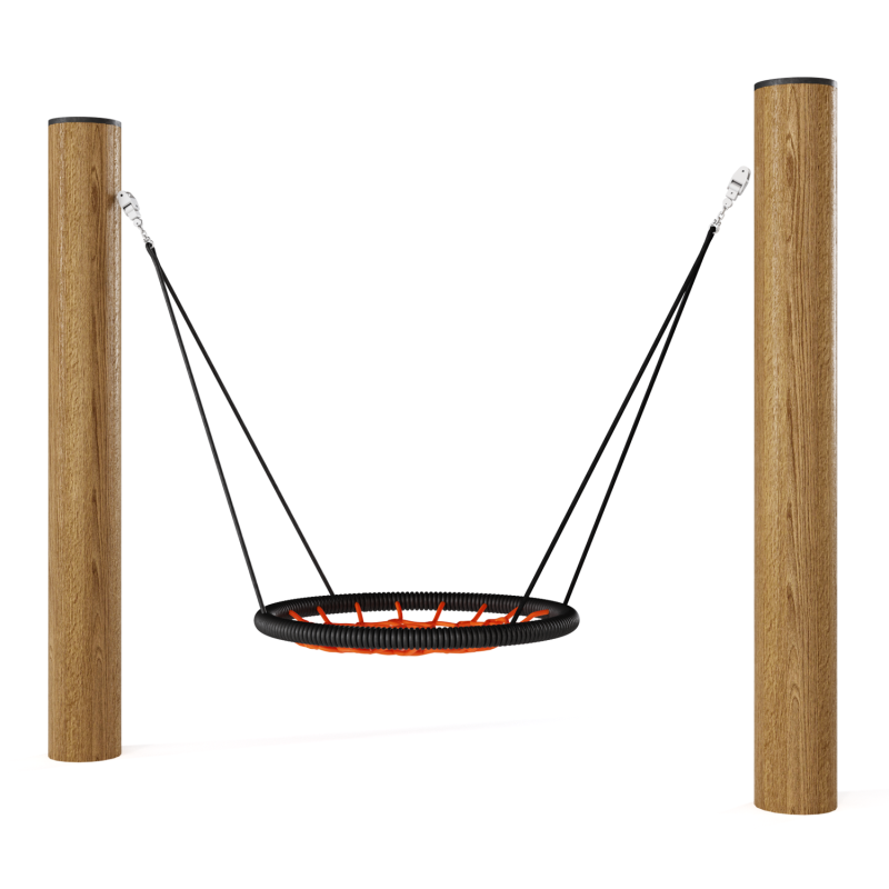 Каркас - дерево, обработанное антисептиком и маслом террасным атмосферостойким для древесины в 2 слоя. Подвесы - канат армированный 16 мм. Качели «Гнездо» - утяжеленный обод, плетение внутри кольца - четырехпрядный мягкий канат 16 мм.