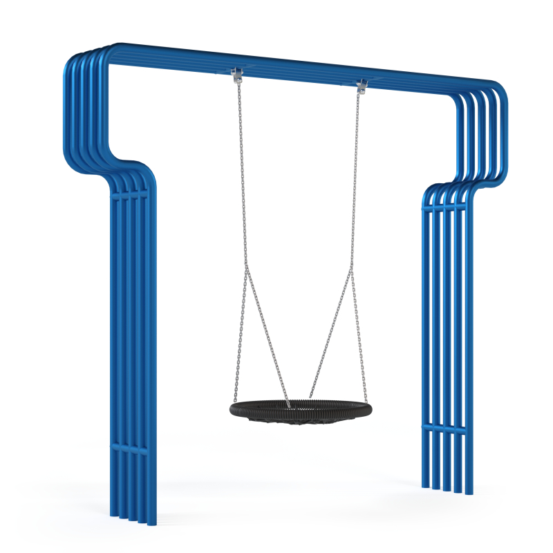 Каркас - сталь конструкционная, покрытие - цинкосодержащий грунт, окраска полимерным порошком (RAL по согласованию). Качели «Гнездо» - утяжеленный обод, плетение внутри кольца - четырехпрядный мягкий канат диаметром 16 мм. Диаметр трубы - 42 мм.