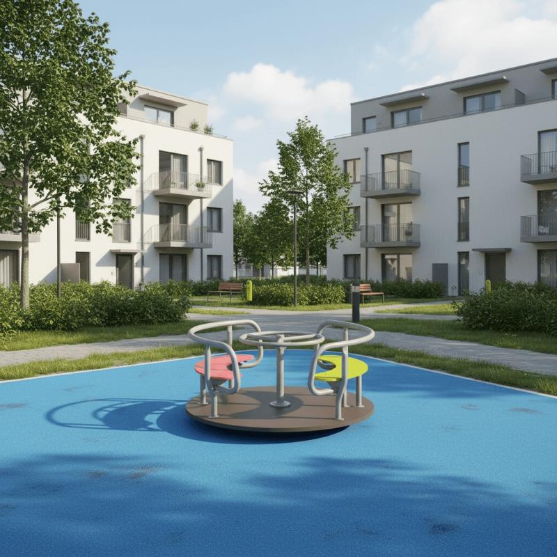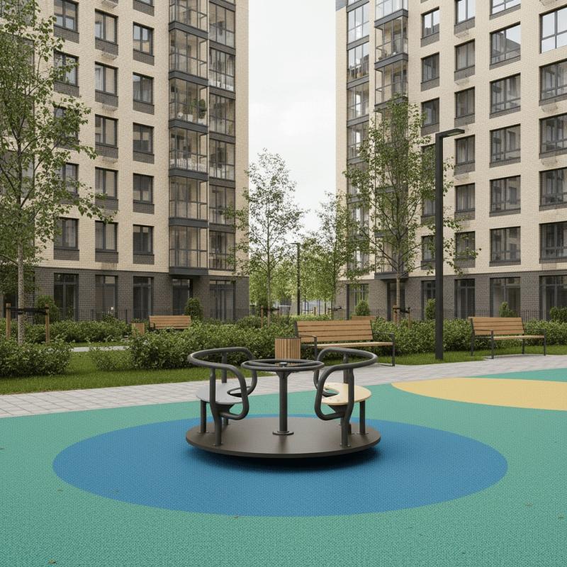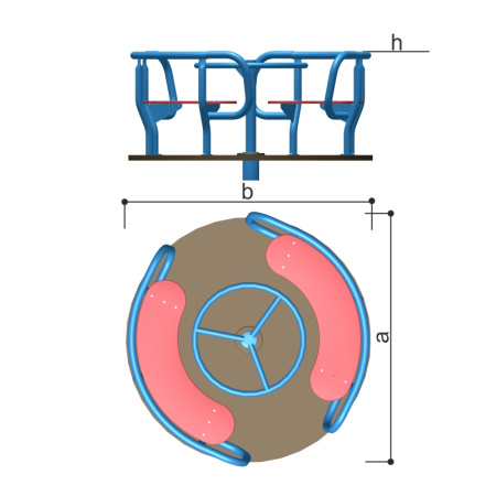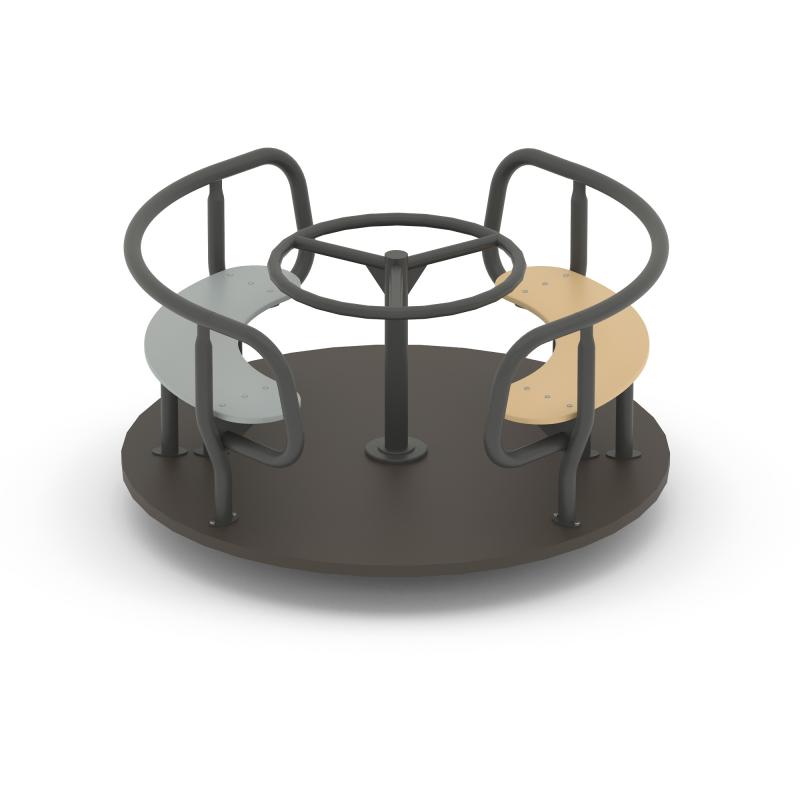 Карусель для детей в возрасте от 3 до 12 лет. Размещается на территориях игровых зон, зон отдыха, спортивных площадках.Выполнена в виде платформы (настил) на узле вращения (шпиль в сборе) с поручнем и сиденьями на настиле.